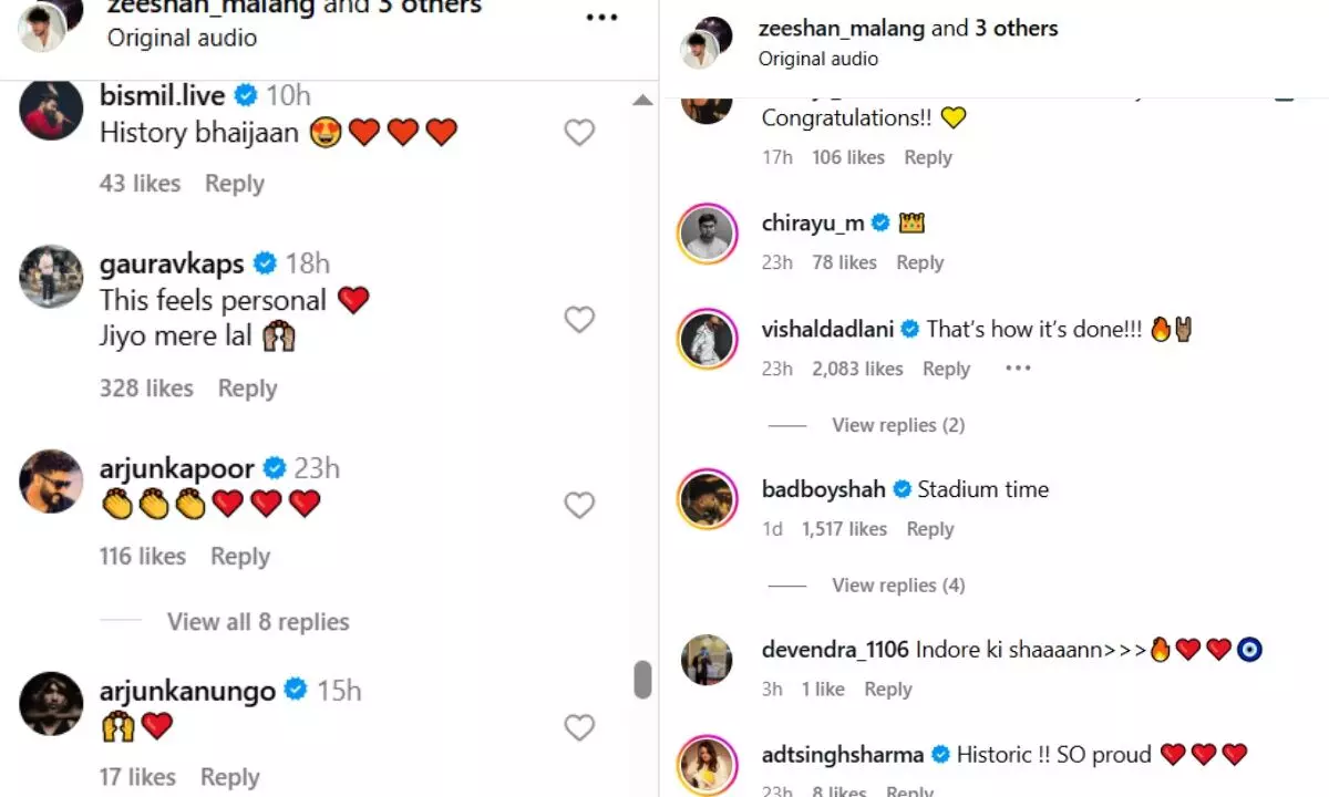 ज़ाकिर खान की इस उपलब्धि पर बॉलीवुड और सोशल मीडिया स्टार्स ने भी खुशी जताई। एक्ट्रेस तब्बू, जरीन खान, फराह खान, के.के. मेनन, अर्जुन कपूर समेत कई सेलेब्स ने सोशल मीडिया पर जाकिर को इस ऐतिहासिक उपलब्धि के लिए बधाई दी।
