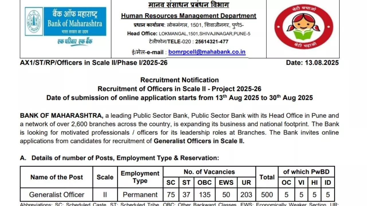 Bank of Maharashtra Recruitment 2025: बैंक ऑफ महाराष्ट्र (Bank of Maharashtra -BOM) ने Generalist Officer Scale II पदों पर भर्ती के लिए आवेदन आमंत्रित किए हैं। इस भर्ती अभियान के तहत कुल 500 पोस्ट भरे जाएंगे। इच्छुक और पात्र उम्मीदवार 30 अगस्त 2025 तक बैंक की आधिकारिक वेबसाइट bankofmaharashtra.in पर जाकर ऑनलाइन आवेदन कर सकते हैं।