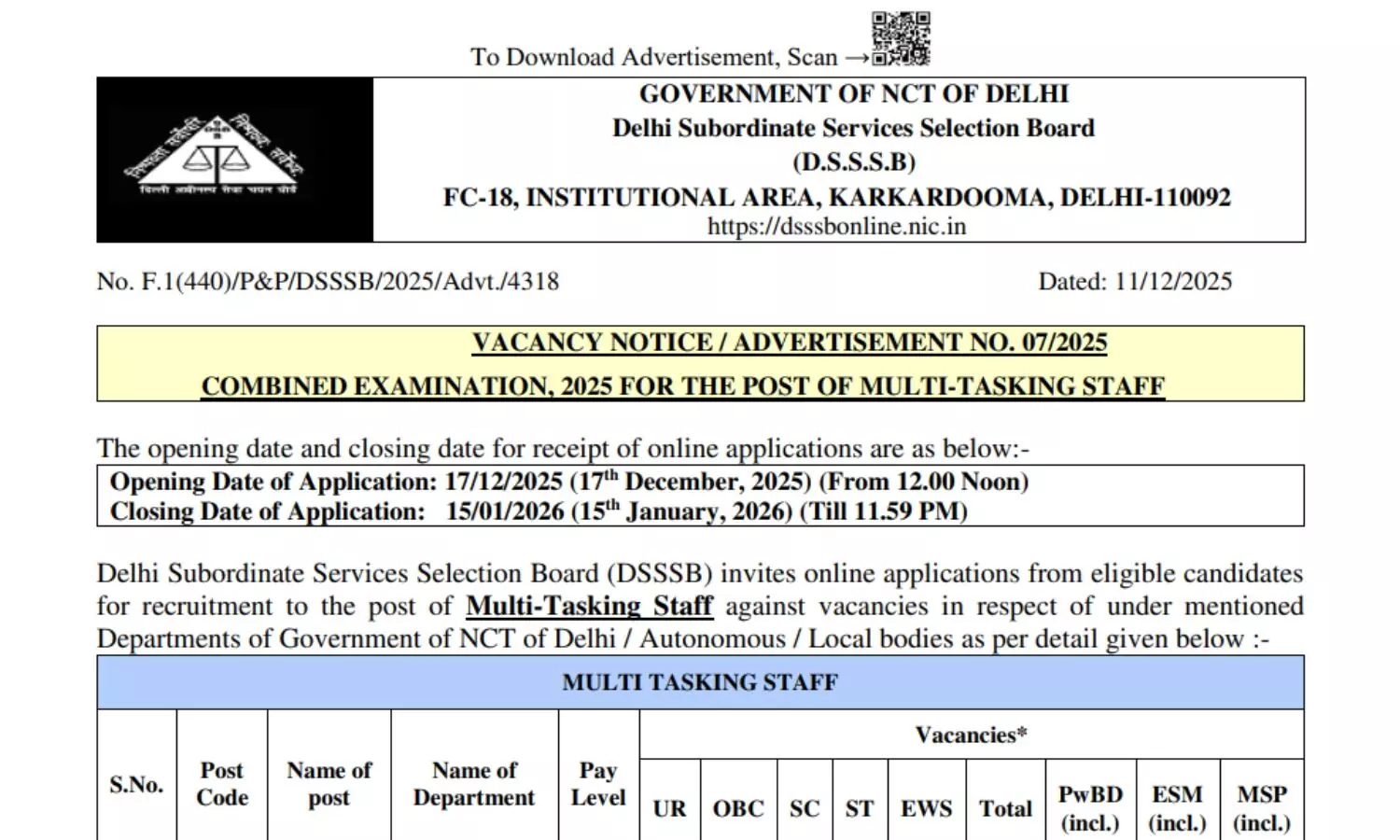 DSSSB Recruitment 2025: दिल्ली अधीनस्थ सेवा चयन बोर्ड (DSSSB) ने मल्टी टास्किंग स्टाफ (MTS) भर्ती 2025 के लिए ऑनलाइन आवेदन प्रक्रिया शुरू कर दी है। उम्मीदवार DSSSB की आधिकारिक वेबसाइट dsssb.delhi.gov.in पर जाकर आवेदन कर सकते हैं। आवेदन की प्रक्रिया 17 दिसंबर 2025 से शुरू हो चुकी है और अंतिम तिथि 15 जनवरी 2026 तय की गई है।