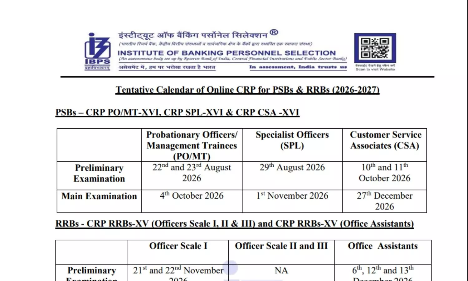 RRBs – CRP RRBs-XV के तहत ऑफिसर स्केल I की प्रीलिम्स परीक्षा 21 और 22 नवम्बर 2026 को होगी। ऑफिस असिस्टेंट उम्मीदवारों की प्रीलिम्स परीक्षा 6, 12 और 13 दिसंबर 2026 को आयोजित की जाएगी। ऑफिसर स्केल II और III के लिए प्रीलिम्स परीक्षा नहीं होगी। ऑफिसर स्केल I और II & III के लिए मेन्स या सिंगल परीक्षा 20 दिसंबर 2026 को आयोजित होगी, जबकि ऑफिस असिस्टेंट की मेन्स परीक्षा 30 जनवरी 2027 को निर्धारित की गई है।