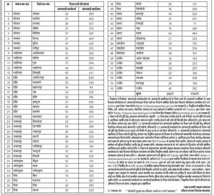MP Anganwadi Bharti 2025 : मध्यप्रदेश में आंगनबाड़ी कार्यकर्ता और सहायिका के 19,500 पदों पर भर्ती के लिए नोटिफिकेशन जारी किया गया है। इनमें से 2,027 पद कार्यकर्ता और 17,477 सहायिका शामिल हैं। आवेदन प्रक्रिया MP Online के जरिए ऑनलाइन होगी।