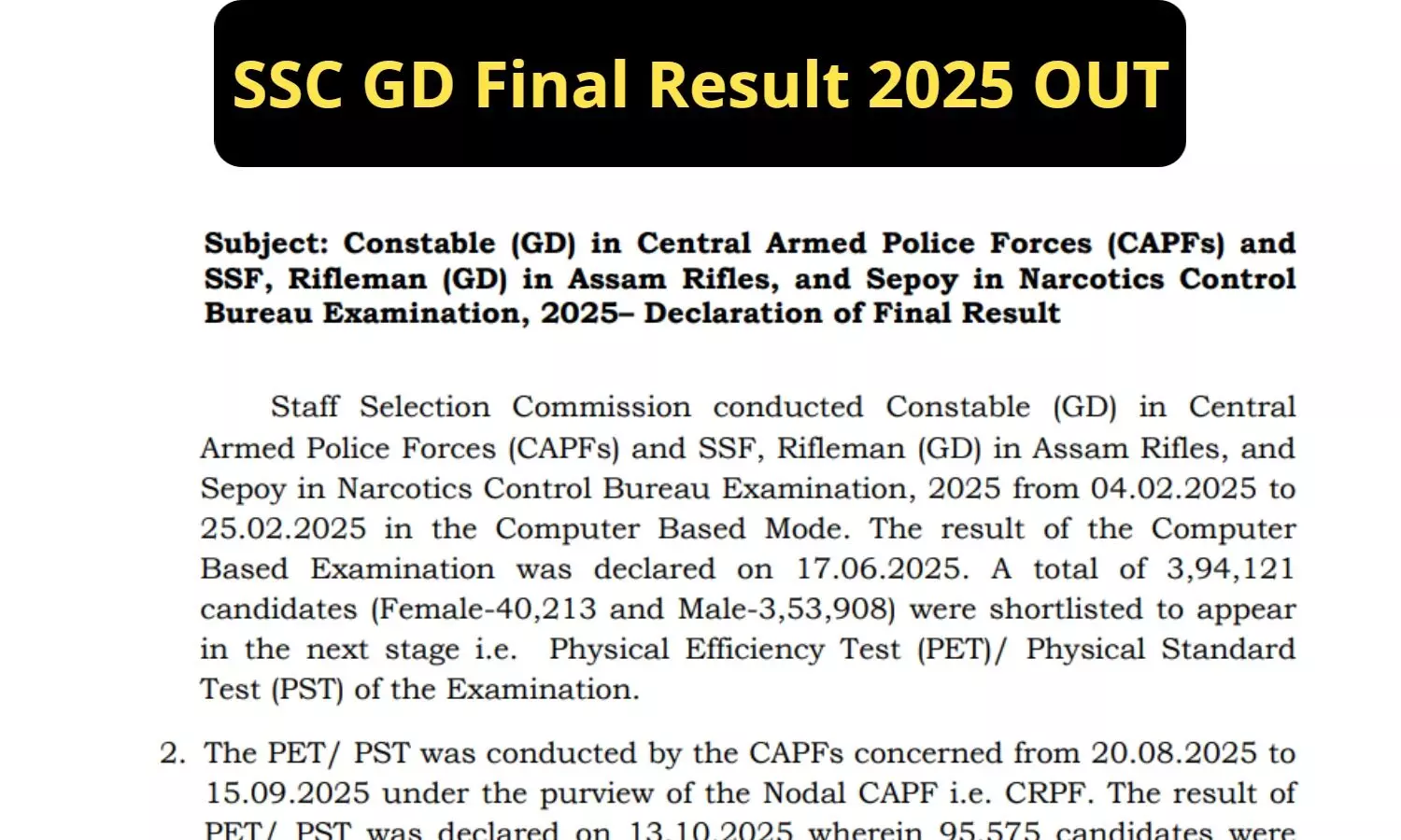 SSC GD Final Result 2025 OUT: स्टाफ सेलेक्शन कमीशन (SSC) ने 2025 के Constable (GD) परीक्षा का फाइनल रिजल्ट जारी कर दिया है। यह रिजल्ट उन उम्मीदवारों के लिए है जिन्होंने Central Armed Police Forces (CAPFs), SSF, Assam Rifles और Narcotics Control Bureau में Constable / Rifleman / Sepoy पदों के लिए परीक्षा दी थी। उम्मीदवार आधिकारिक वेबसाइट ssc.gov.in पर जाकर अपना रिजल्ट चेक कर सकते हैं।