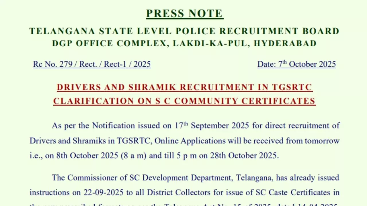 Telangana Police Recruitment 2025: तेलंगाना पुलिस भर्ती बोर्ड (TLSPRB) ने 8 अक्टूबर 2025 से ड्राइवर और श्रमिक (Shramik) पदों के लिए आवेदन प्रक्रिया शुरू कर दी है। इच्छुक उम्मीदवार TLSPRB की आधिकारिक वेबसाइट tgprb.in पर जाकर सीधे आवेदन कर सकते हैं।