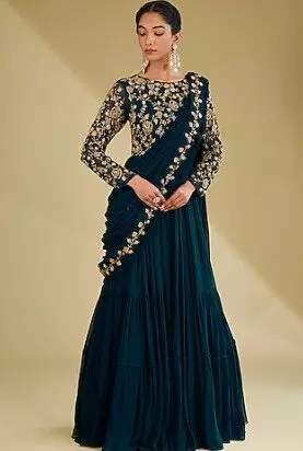 गाउन स्टाइल साड़ी एक अनोखा संयोजन है जो आपको साड़ी और गाउन दोनों का खूबसूरत लुक देता है। इसके साथ आप बिना किसी परेशानी के फंक्शन में जा सकती हैं। गाउन स्टाइल साड़ी में नीचे की हिस्से की गाऊन ड्रैस होती है, जो पल्लू के ऊपर सुरक्षित रूप से लगाई जाती है। इसे पहनने में किसी प्रकार की दिक्कत नहीं होती, क्योंकि यह पहले से ही तैयार होती है। इस स्टाइल की साड़ी को आप लाइट मेकअप और हल्के आभूषणों के साथ पहनिए, ताकि लुक और भी निखर जाए।