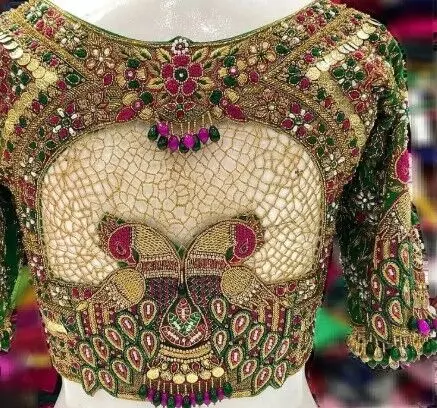 मोर भारतीय संस्कृति का प्रतीक है, जो सौंदर्य, प्रेम और सौभाग्य का प्रतीक माना जाता है। मोर वाले ब्लाउज डिजाइन में धागे की कढ़ाई, जरी का काम या रंगीन मोती-जरी से बनी मोर आकृति को सजाया जाता है। यह डिजाइन खासतौर पर लाल, हरे और नीले रंग के लहंगों पर बेहद खूबसूरत लगता है। इस तरह का ब्लाउज आपकी दुल्हन लुक में राजसी छवि लेकर आता है, जो सबका ध्यान अपनी ओर खींच लेता है।