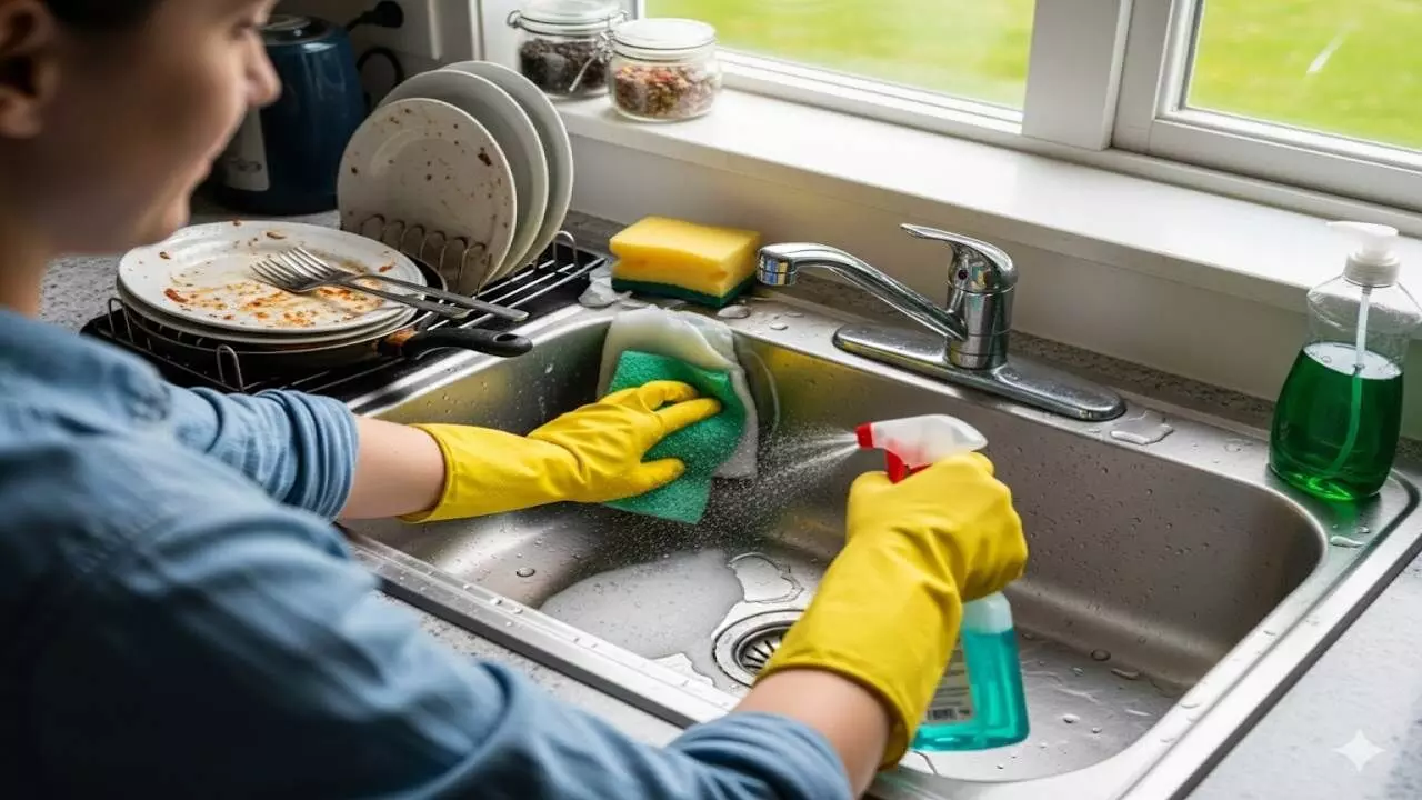 गर्म पानी और डिशवॉशिंग लिक्विड: अगर सिंक पर चिकनाई या ऑयल की परत जम गई है तो गर्म पानी में डिशवॉशिंग लिक्विड डालकर स्क्रब करें। यह आसान तरीका तेल और चिकनाई को तुरंत साफ कर देता है।
