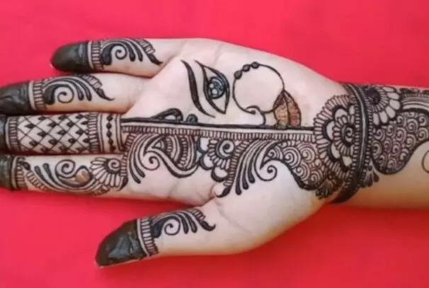 नवरात्रि के मौके पर अगर आप मां दुर्गा को समर्पित कोई डिजाइन चाहती हैं तो देवी मेहंदी डिजाइन आपके लिए परफेक्ट है। इसमें मां दुर्गा की आंखें, सिंदूर से सजी बिंदी या शेर का चित्र उकेरा जाता है। इस तरह की मेहंदी खासकर करवा चौथ और दुर्गा अष्टमी जैसे दिनों पर भी खूब पसंद की जाती है। यह आपके हाथों को एक अलग आध्यात्मिक आभा देती है।