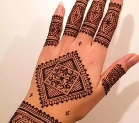 आजकल लड़कियों के बीच डायमंड शेप मेहंदी डिज़ाइन काफी ट्रेंड में है। इसमें डायमंड के आकार के पैटर्न्स हथेली या कलाई पर बनाए जाते हैं और उनके अंदर बारीक डिटेलिंग की जाती है। यह डिज़ाइन आपके हाथों को यूनिक और मॉडर्न लुक देता है। अगर आप नवरात्रि में किसी गरबा या डांडिया नाइट में जा रही हैं, तो यह मेहंदी डिज़ाइन आपके ट्रेडिशनल आउटफिट को और भी ज्यादा आकर्षक बना देगा।