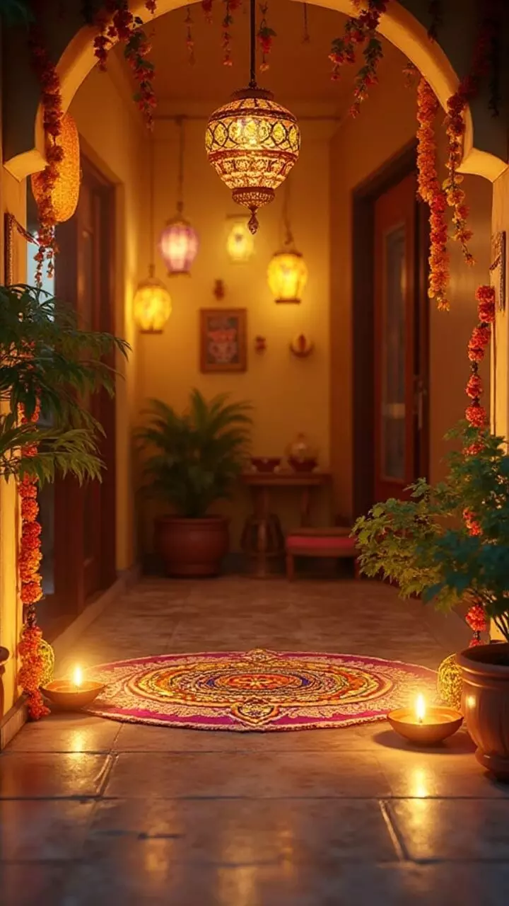 गेंदा, गुलाब और चमेली के फूलों से बनी मालाएं या तोरण आपके घर की एंट्रेंस को सुंदर बना देती हैं। आप चाहें तो पेपर फ्लावर गारलैंड बनाकर भी सजावट कर सकते हैं—जो टिकाऊ और सस्ती होती है।