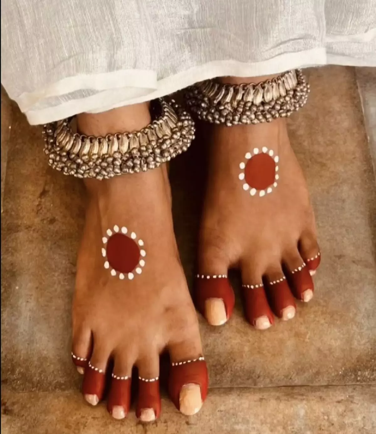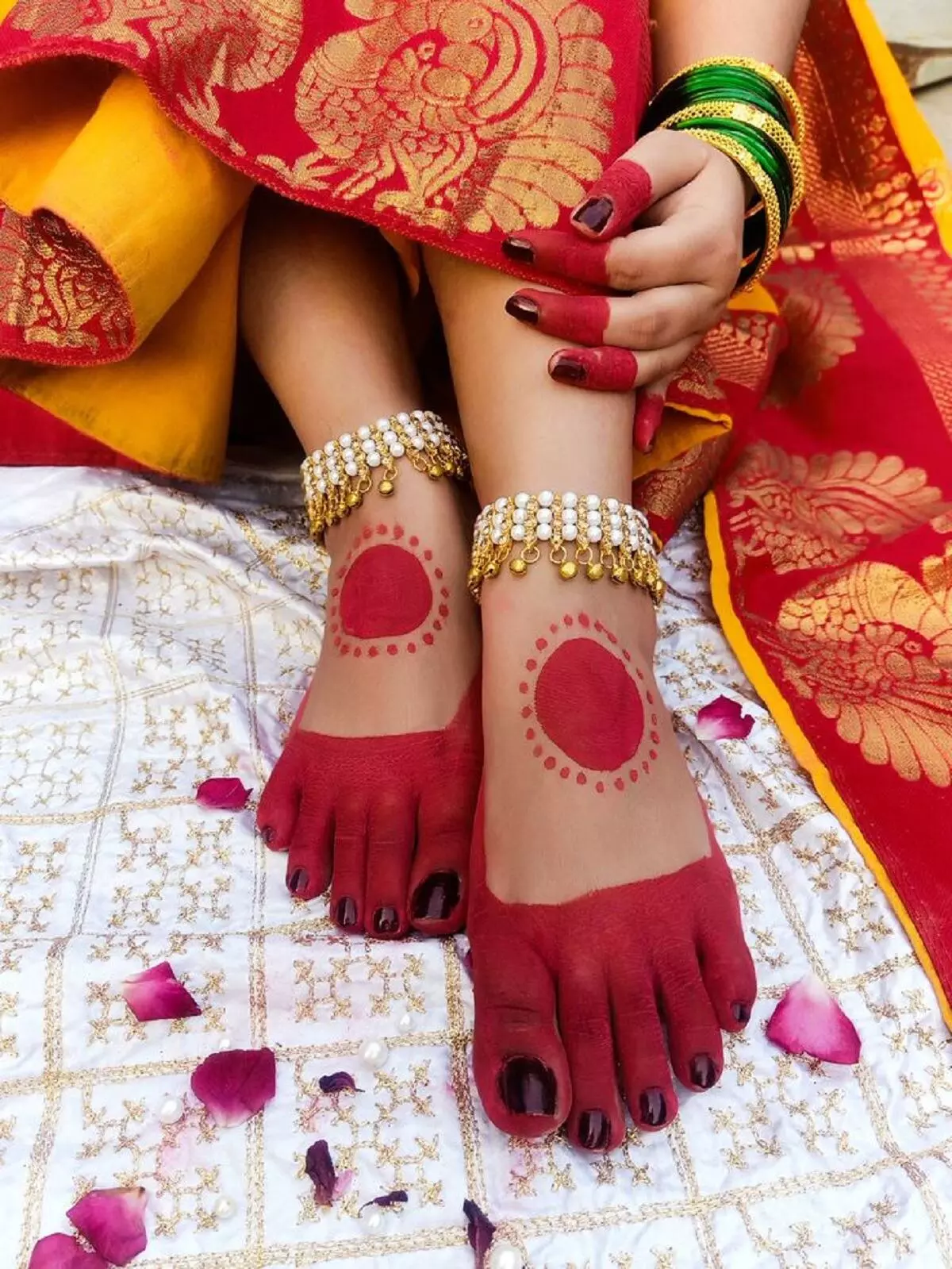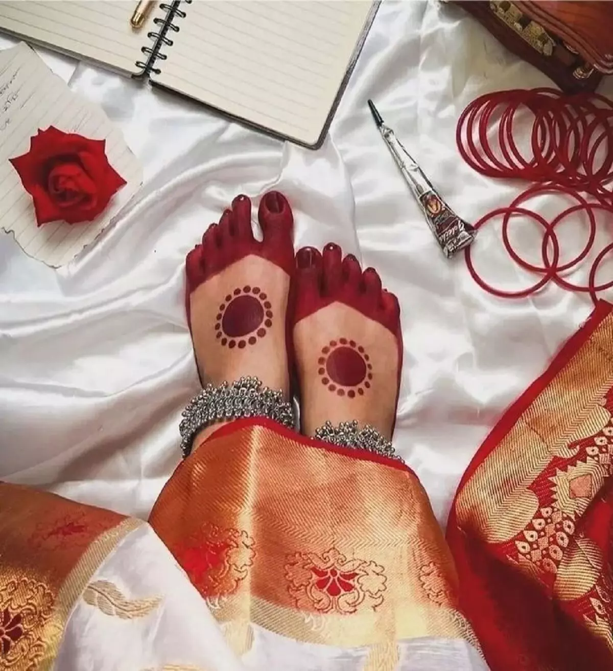 अगर आप सिंपल और मिनीमल आलता डिजाइन चाहती है, तो नीचे दिए गए पैटर्न को ट्राय कर सकती है। इसके लिए सिर्फ आपको सिंदूरी लाल रंग का माहवर लेना है, फिर पैरों में थोड़ी सी हल्दी लगाकर आलता से सिंपल पैरों के तलबे पर बेल बनाएं और पैरों के ठीक बीच में गोल टिक्की बनाएं।
