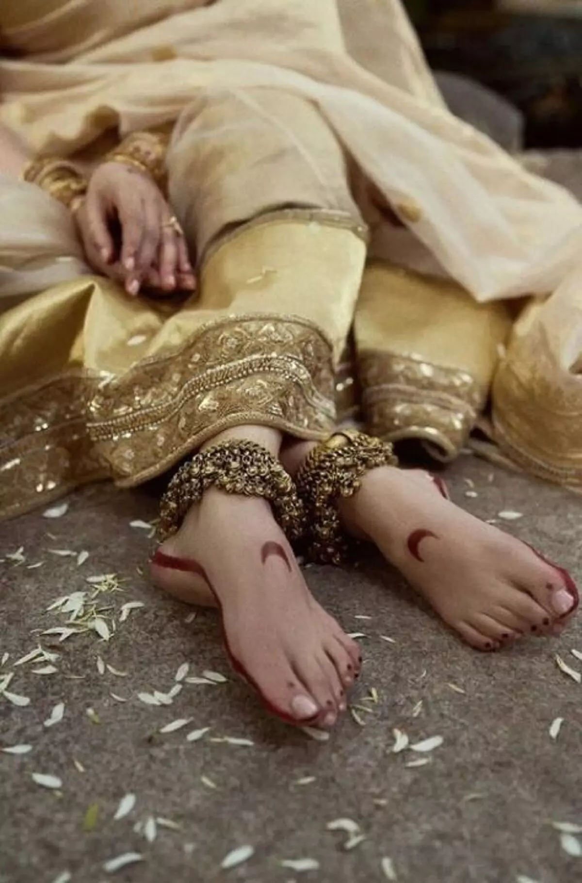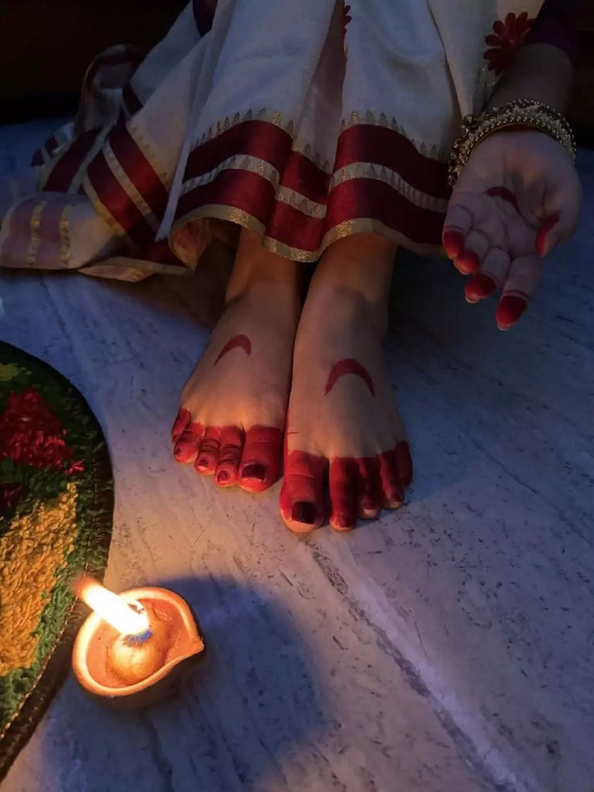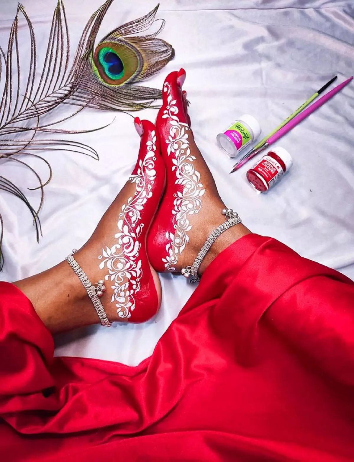 अगर आप सिंपल और मिनीमल आलता डिजाइन चाहती है, तो नीचे दिए गए पैटर्न को ट्राय कर सकती है। इसके लिए सिर्फ आपको सिंदूरी लाल रंग का माहवर लेना है, फिर पैरों में थोड़ी सी हल्दी लगाकर आलता से सिंपल पैरों के तलबे पर बेल बनाएं और पैरों के ठीक बीच में गोल टिक्की बनाएं।