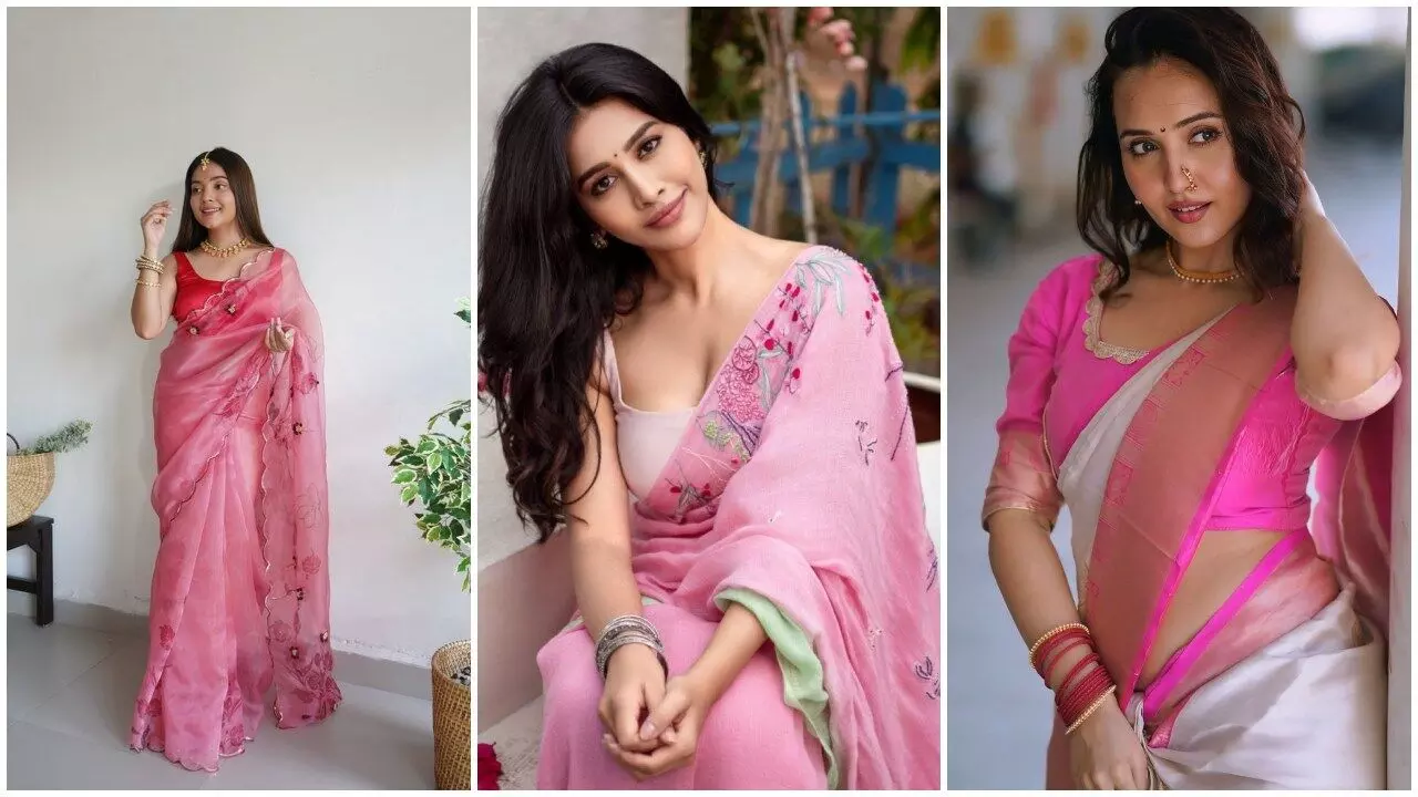 ऑर्गेंजा साड़ी इन दिनों काफी ट्रेंड में है। यह हल्की, आरामदायक और बेहद स्टाइलिश होती हैं। गुलाबी रंग में यह साड़ी तीज के अवसर पर बेहद एस्थेटिक लुक देती है और पारंपरिक के साथ-साथ मॉडर्न टच भी देती है।