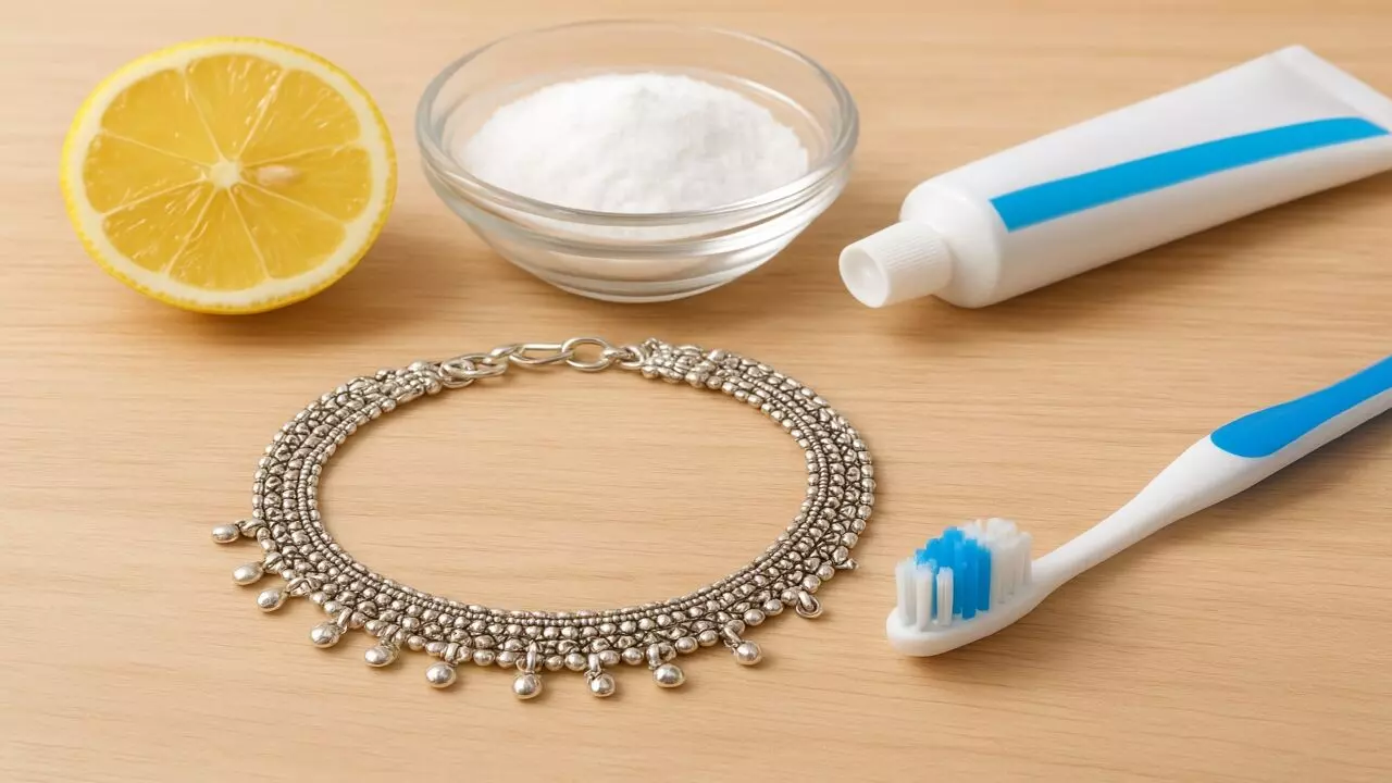 बेकिंग सोडा और सिरका का मिश्रण: एक बाउल में एक चम्मच बेकिंग सोडा और दो चम्मच सिरका डालें। जब झाग उठे, तब उसमें पायजेब डालें और 5 मिनट बाद निकालकर साफ करें। यह घरेलू उपाय गहरी जमी मैल को भी हटा देता है और सिल्वर ज्वेलरी में शाइन लौटा देता है।