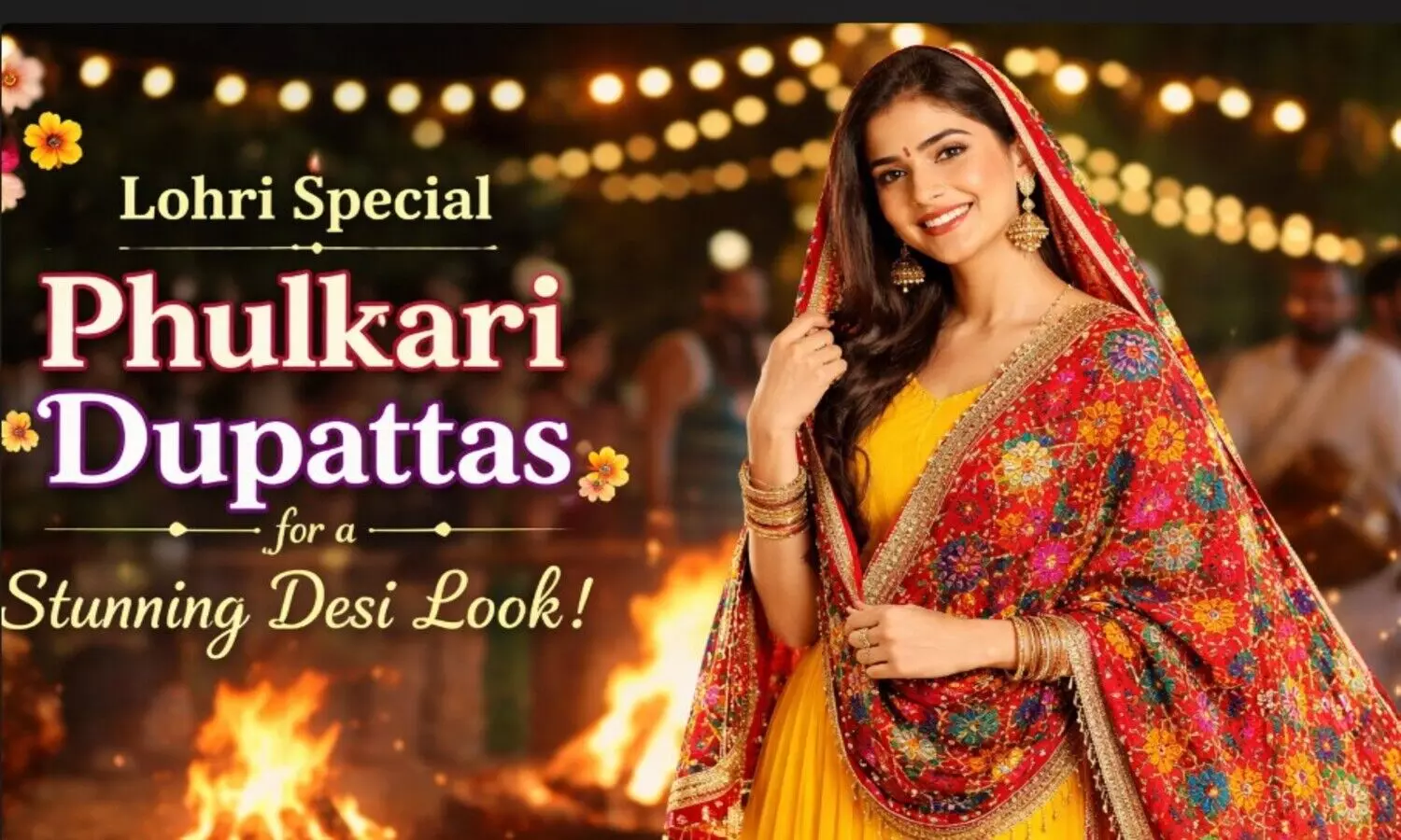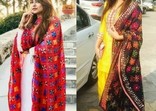 लोहड़ी पर फुलकारी दुपट्टा कैसे स्टाइल करें- ब्राइट रंग जैसे लाल, पीला, नारंगी और हरा चुनें।