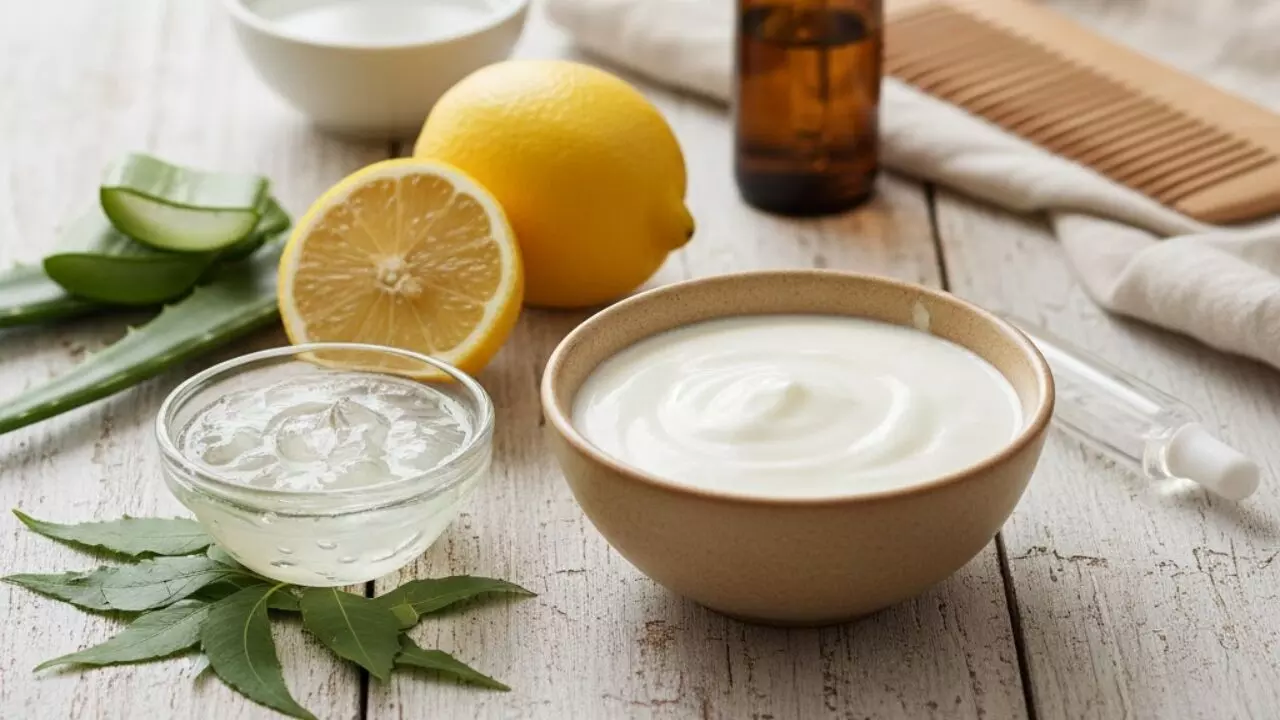 नारियल तेल और नींबू का मिश्रण: एक कटोरी नारियल तेल को हल्का गुनगुना करें और उसमें आधे नींबू का रस मिलाएं। इस मिश्रण से सिर की हल्की मालिश करें। नींबू स्कैल्प के फंगस को खत्म करता है और नारियल तेल सूखापन दूर करता है। हफ्ते में दो बार इसका इस्तेमाल डैंड्रफ को काफी हद तक कम कर देता है।