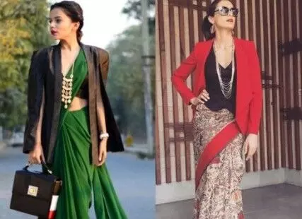 अगर आप थोड़ा मॉडर्न टच चाहती हैं, तो साड़ी के साथ छोटी जैकेट का चुनाव करें। यह लुक युवतियों में आजकल काफी लोकप्रिय है। छोटी जैकेट या ब्लाउज स्टाइल जैकेट आपकी साड़ी को एक नया आयाम देती है। रेशम, मिरर वर्क या हैंड एम्ब्रॉयडरी वाली छोटी जैकेट साड़ी के साथ बेहद खूबसूरत लगती है। यह आपके लुक में फ्यूज़न का तड़का जोड़ती है। हल्की साड़ियों जैसे ऑर्गेंजा, चंदेरी या कॉटन साड़ी के साथ यह जैकेट लुक बहुत सुंदर लगता है। यह स्टाइल दिन की शादी या हल्दी-मेहंदी जैसे कार्यक्रमों के लिए एकदम उपयुक्त है। रंगों के मेल पर ध्यान देना न भूलें। अगर आपकी साड़ी हल्के रंग की है तो गहरे रंग की जैकेट चुनें और अगर साड़ी गहरे रंग की है तो हल्के या सुनहरे रंग की जैकेट शानदार दिखेगी।
