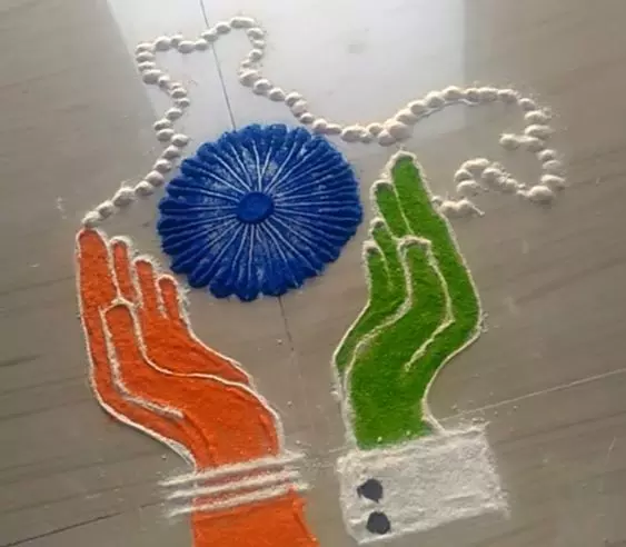 अपने हाथों के छापों से तिरंगे के रंगों में रंगोली बनाएं। यह बच्चों के लिए मजेदार और आकर्षक डिजाइन है।