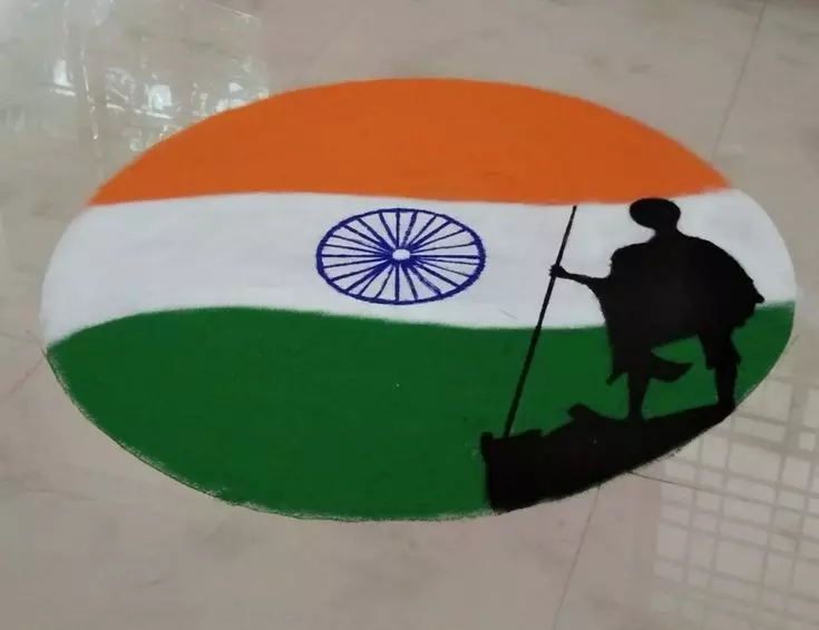 एक गोल आकार का गोला बनाएं और केसरिया और सफेद रंगों को झंडे के जैसे सजाए और साइड में बापू जी की काले रंग से आकृति बनांए। इस डिजाइन से देशभक्ति और देश के महान नेता राष्ट्रपिता महात्मा गांधी के संदेश मिलते है।