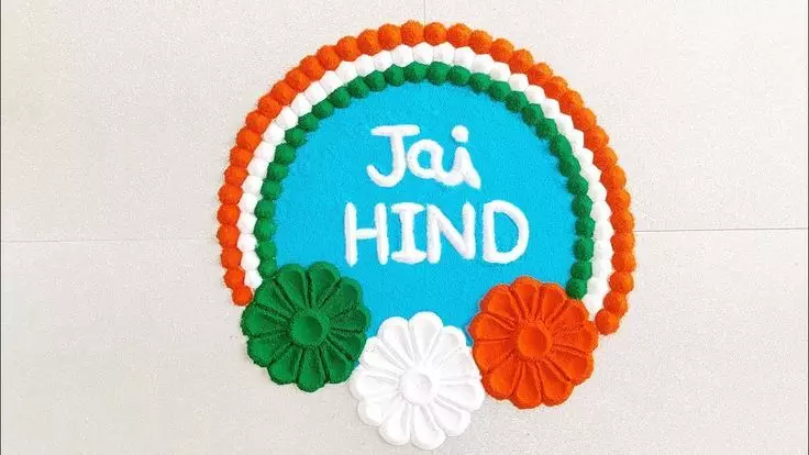 तिरंगे के तीनों रंगों- केसरिया, सफेद और हरे में फूलों के डिजाइन बनाएं। बीच में नीला चक्र बनाकर बीच में जय हिंद लिखकर इसे पूरा करें। यह डिजाइन देखने में बेहद खूबसूरत और सिंपल होता है, जो किसी भी जगह की शोभा बढ़ा देता है।