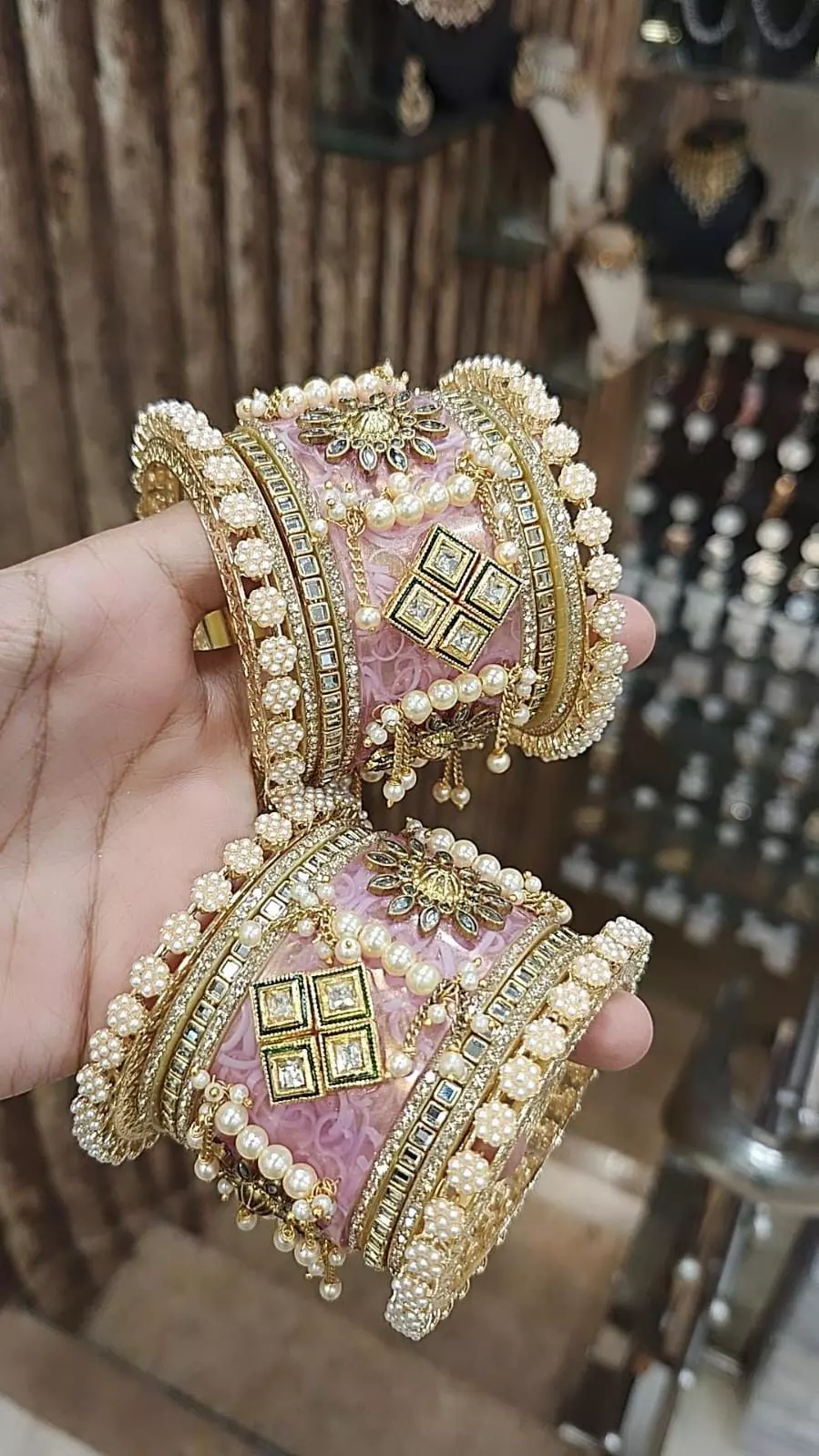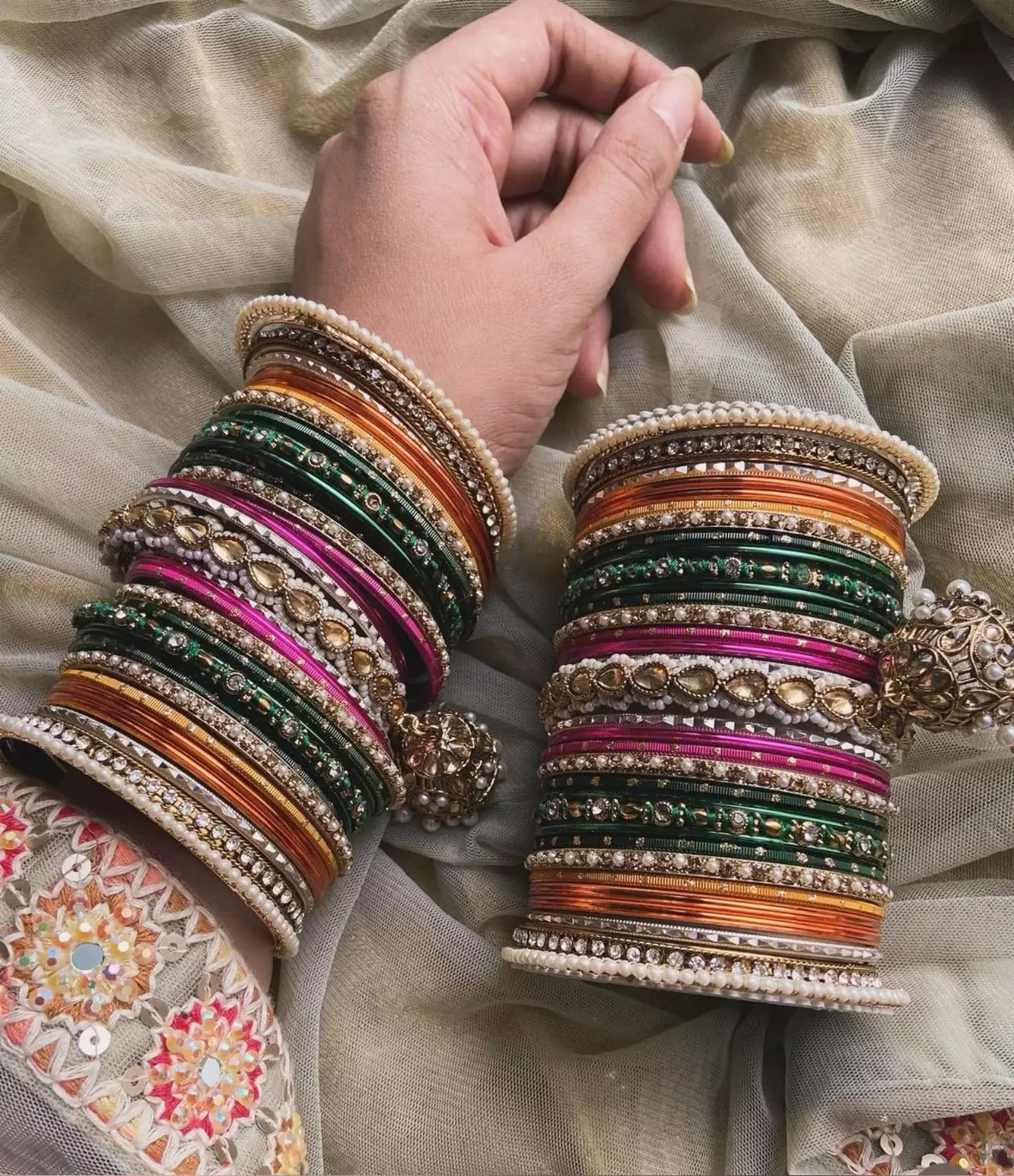 स्टोन-कुंदन वर्क चूड़ियां: अगर आपका आउटफिट हैवी है जैसे बनारसी साड़ी, सिल्क साड़ी या इंडो-वेस्टर्न या रॉयल गाउन तो इनके संग स्टोन और कुंदन वर्क वाली चूड़ियां बेस्ट ऑप्शन हैं। ये सिर्फ हाथों की खूबसूरती नहीं बढ़ाती बल्कि पूरे लुक को रॉयल और ग्लैमरस टच देती हैं। इन पर मिरर वर्क और अमेरिकन डायमंड का वर्क किया जाता है, जो हाथों की खूबसूरती को और बढ़ा देता हैं। लाइट और मिनिमल स्टोन-कुंदन चूड़ियां आजकल बहुत पसंद की जा रही हैं। पूरे सेट के बाजाय इन्हें पतली कांच की चूड़ियों के बीच पहन सकती हैं, इससे हाथों में स्टाइल और बैलेंस दोनों नजर आता है और लुक भी भारी नहीं लगता है।