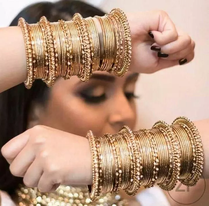गोल्डन-मैटेलिक चूड़ियां: करवा चौथ पर अपने लुक में रॉयल और मॉडर्न दोनों अंदाज जोड़ने के लिए गोल्डन मैटेलिक चूड़ियां परफेक्ट लगती हैं। गोल्डन चूड़ियां जहां ट्रेडिशनल ड्रेसेस को रॉयल टच देती हैं, वहीं मैटेलिक स्टाइल की चूड़ियां इंडो-वेस्टर्न ड्रेस पर ग्लैमरस लुक क्रिएट करती हैं। इन दिनों पतली और मिनिमल गोल्डन चूड़ियां, चौड़ी डिजाइन वाली गोल्डन चूड़ियां, स्टोन-स्टडेड या एंबोसेड मैटेलिक चूड़ियां ट्रेंड में हैं। इन्हें आप अपनी पसंद के अनुसार कांच या स्टोन चूड़ियां के साथ लेयर करके पहन सकती हैं।