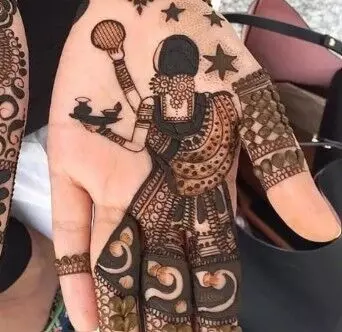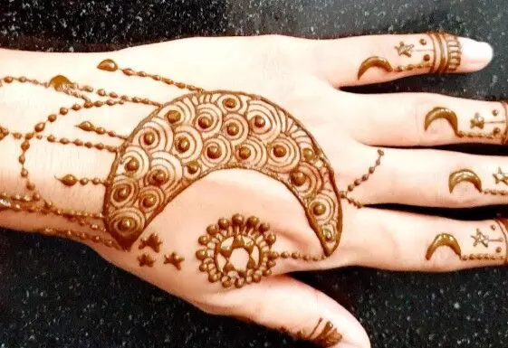 आजकल हाफ मून यानी आधा चांद डिज़ाइन काफी ट्रेंड में है। यह डिजाइन देखने में बेहद यूनिक और खूबसूरत लगता है। हथेली पर आधा चांद बनाकर उसके चारों ओर छोटे सितारे और बिंदियां सजाई जाती हैं। यह डिजाइन सिंपल होने के साथ-साथ बहुत ही आकर्षक दिखती है। अगर आप करवा चौथ पर मॉडर्न लुक चाहती हैं तो यह डिजाइन परफेक्ट चॉइस है।