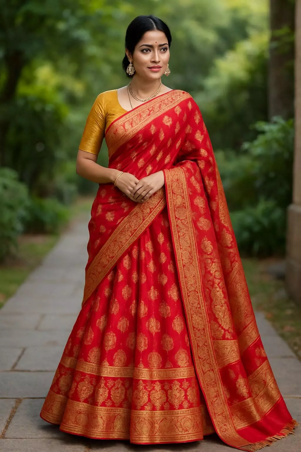 अगर आप साड़ी पहनना पसंद करती हैं, तो इस बार उसे लहंगा स्टाइल में ट्राय करें। सिल्क साड़ी के साथ हैवी बॉर्डर वाला ब्लाउज या कंट्रास्ट एंब्रॉयडरी वाला लुक फॉर्मल भी लगेगा और फेस्टिव भी। प्रिंटेड साड़ी को डीप नेक या बैलून स्लीव्स वाले ब्लाउज के साथ पहनें। दो साड़ियों को मिलाकर डबल ड्रेप या लहंगा स्टाइल में पहनना एक नया और ट्रेंडिंग स्टाइल है।