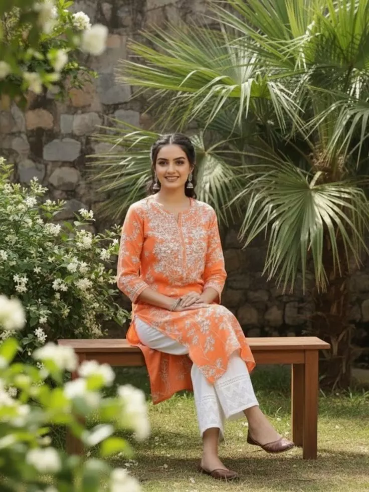 नारंगी रंग का प्रिंटेड कुर्ता आपको फ्रेश और ब्राइट लुक देता है। यह खासतौर पर कॉलेज स्टूडेंट्स या कैजुअल फंक्शन के लिए अच्छा ऑप्शन है। इसे सफेद प्लाजो, लेगिंग या जींस के साथ स्टाइल कर सकती हैं।