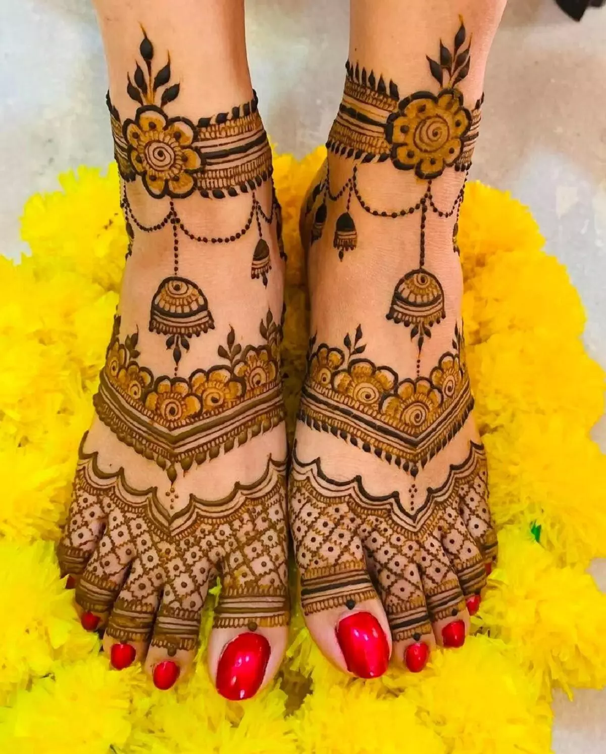 इस प्रकार के डिजाइन्स पैरों में काफी सुंदर लगते हैं। खासकर सुहागनों पर। तीज-त्यौहार, सावन के पावन महीने से लेकर करवा चौथ पर आप इस प्रकार के यूनिक और क्रिएटिव डिजाइन्स को ट्राय कर सकते हैं।