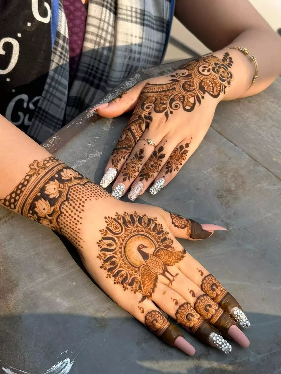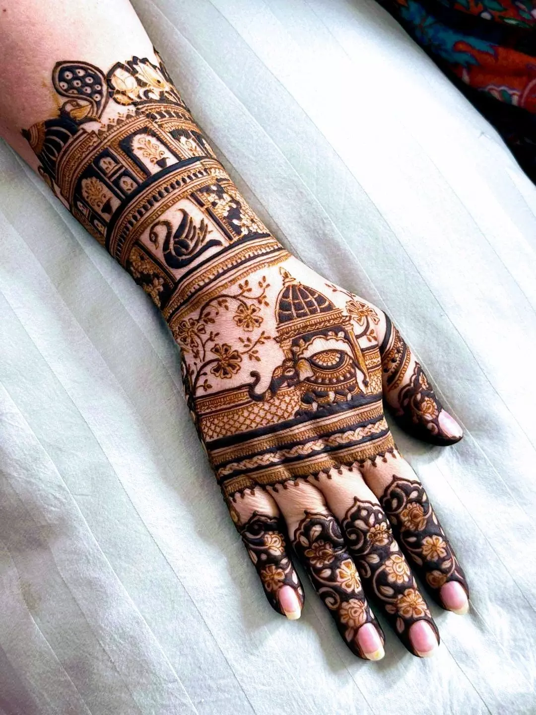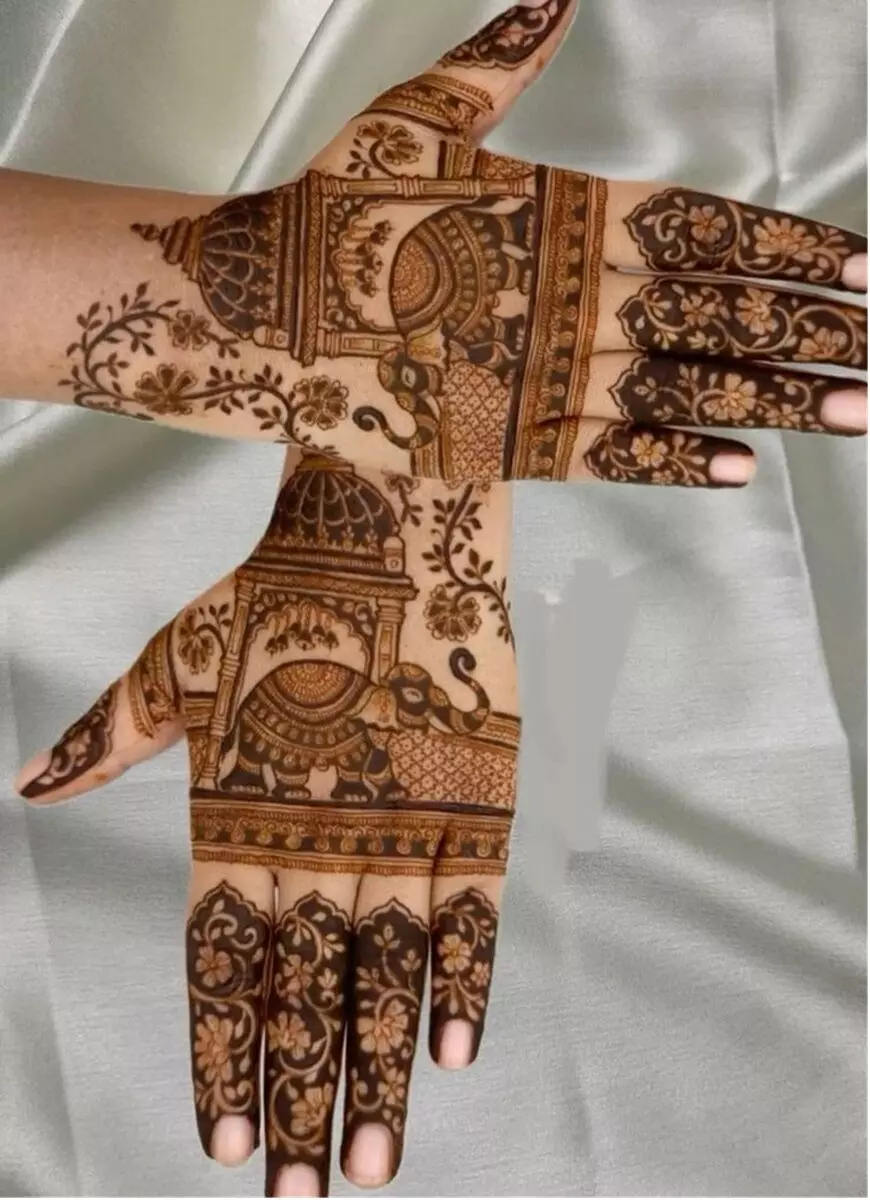 सावन में अगर आप रॉयल और ट्रेडिशनल लुक चाहती हैं तो यह शानदार मेहंदी डिज़ाइन परफेक्ट है। इस डिजाइन में खूबसूरत मंदिर आर्ट, झरोखे और हाथी की कलाकारी इसे खास बनाती है। खास मौकों जैसे हरियाली तीज और रक्षाबंधन पर यह डिटेल्ड मेहंदी आपके हाथों को शाही लुक देगी।