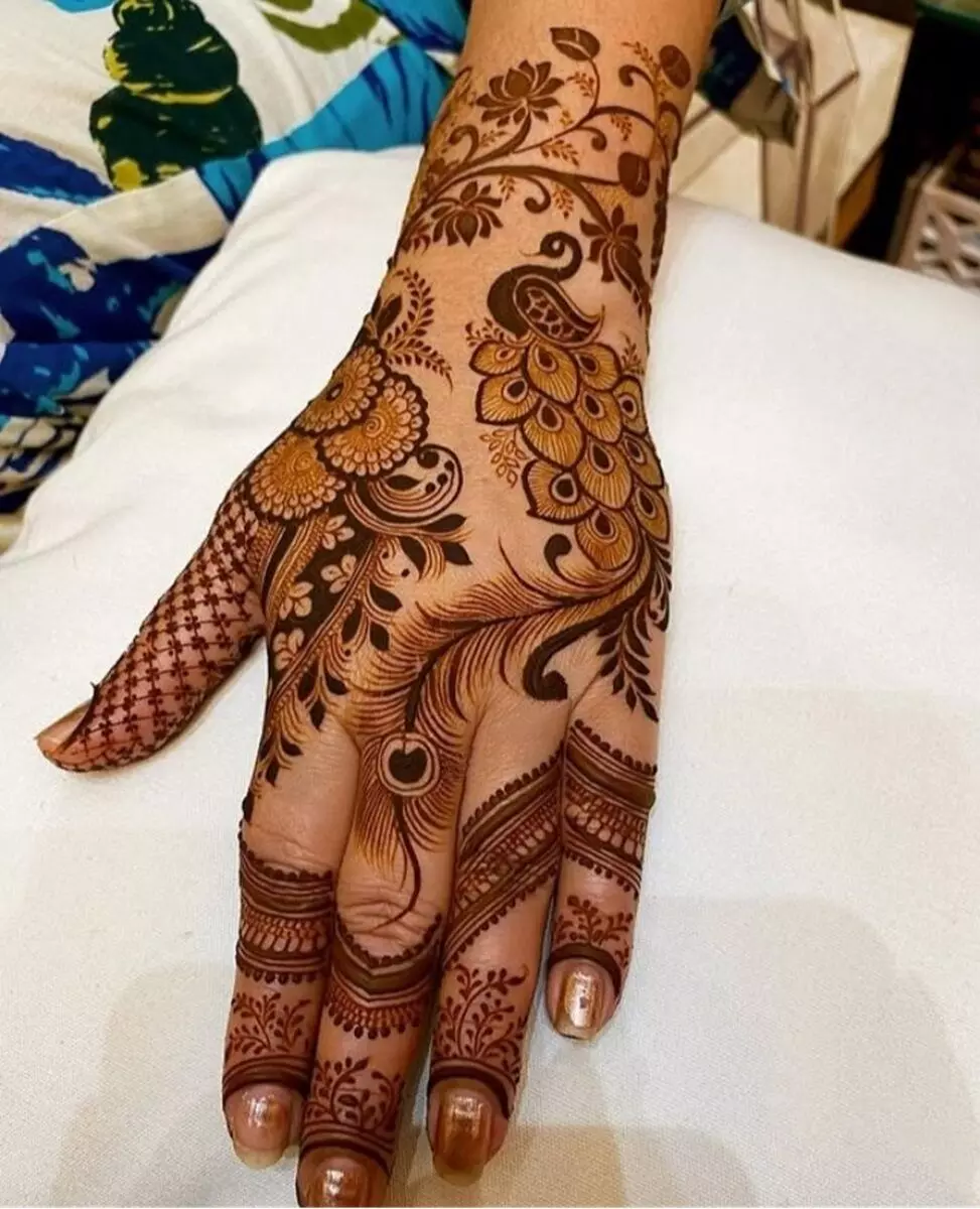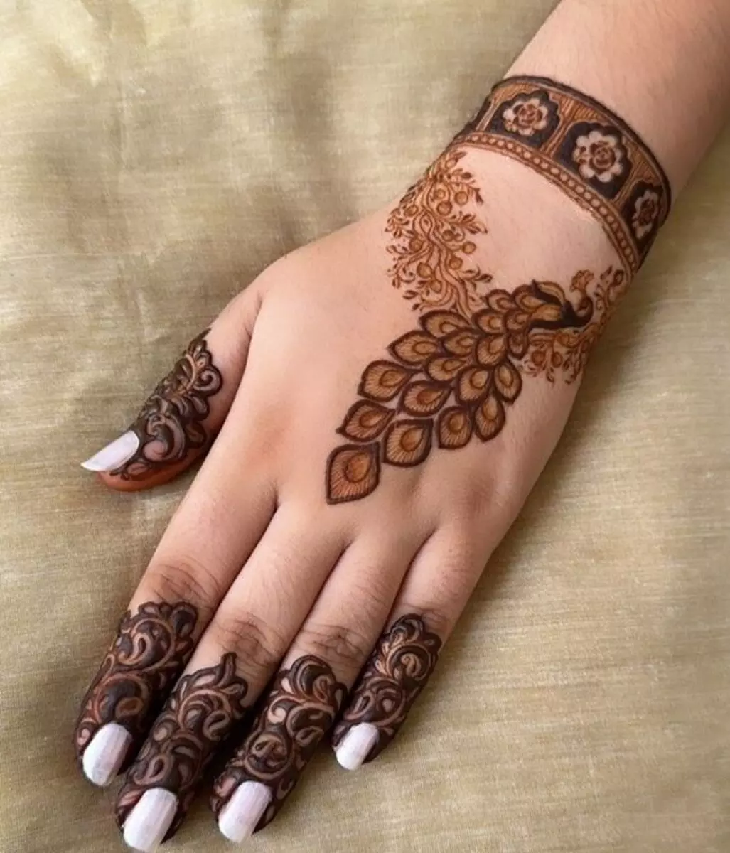 अगर आप सावन में सिंपल और क्लासी लुक चाहती हैं तो यह फ्लोरल अरेबिक मेहंदी डिज़ाइन बेस्ट ऑप्शन है। इसमें खूबसूरत फूलों के पैटर्न और स्टाइलिश फिंगर डिजाइन हाथों को बेहद आकर्षक बनाते हैं। यह डिजाइन कम समय में बनने वाला और हर फेस्टिव लुक के साथ परफेक्ट मैच करता है।