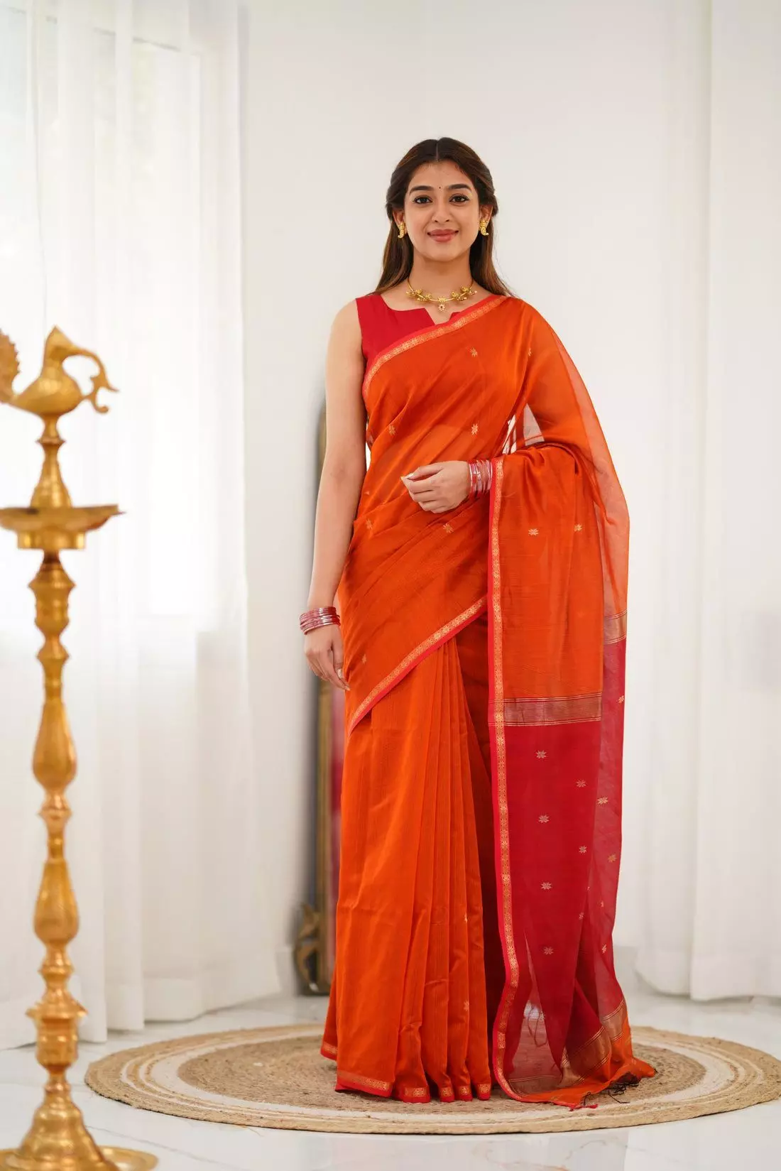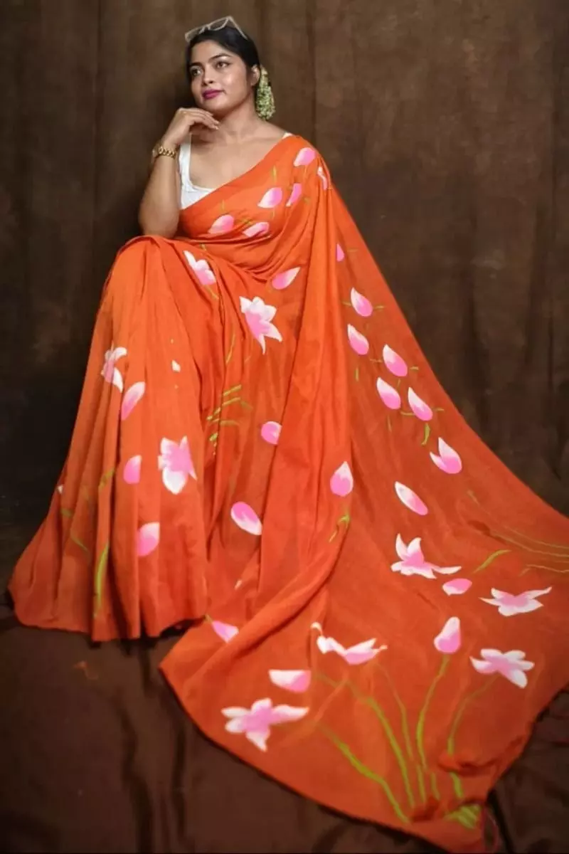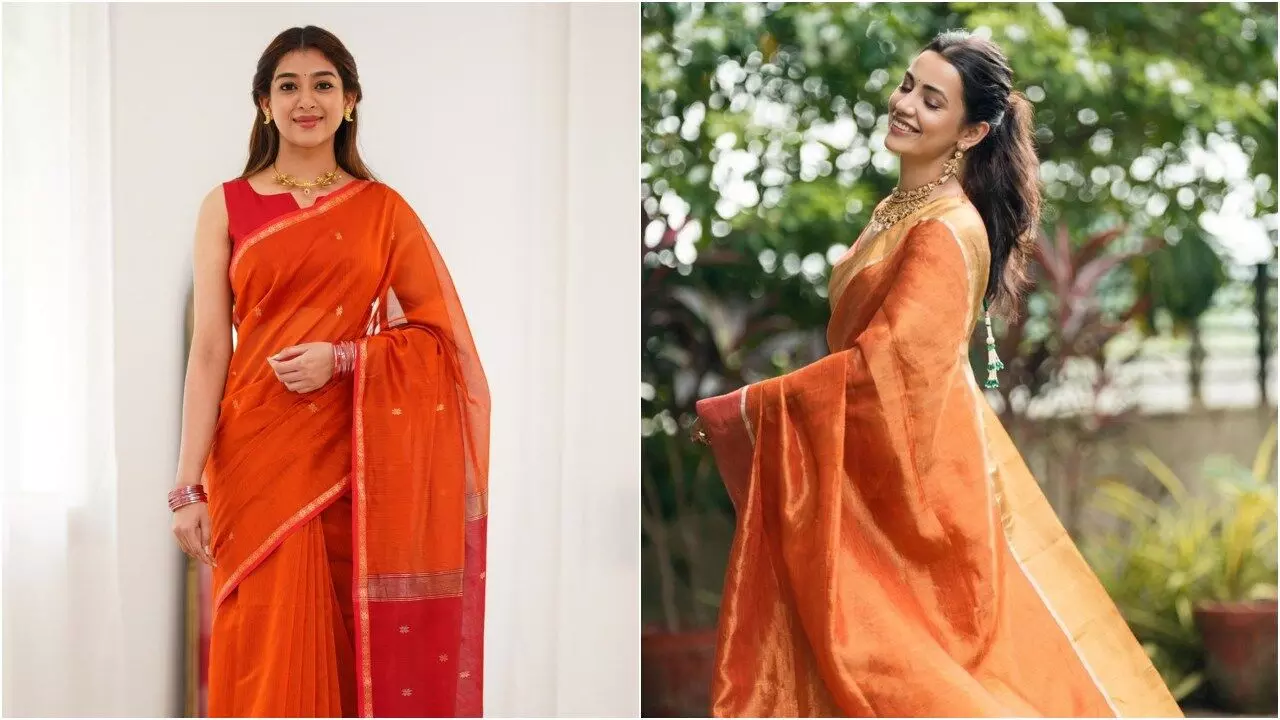 इस दिन विशेष रूप से नारंगी रंग पहनना शुभ माना जाता है, क्योंकि यह रंग ऊर्जा, उत्साह और सकारात्मकता का प्रतीक है। यह रंग मां दुर्गा की शक्ति और आशीर्वाद को आकर्षित करता है, जिससे आपकी मनोकामनाएं पूरी होती हैं और जीवन में खुशहाली आती है। ऐसे में अगर आप नवरात्रि की शुरुआत ट्रेडिशनल और खास अंदाज में करना चाहती हैं, तो नारंगी रंग की साड़ी आपके लिए परफेक्ट ऑप्शन हो सकता है। आइए देखें कुछ ट्रेंडिंग साड़ी फोटो।