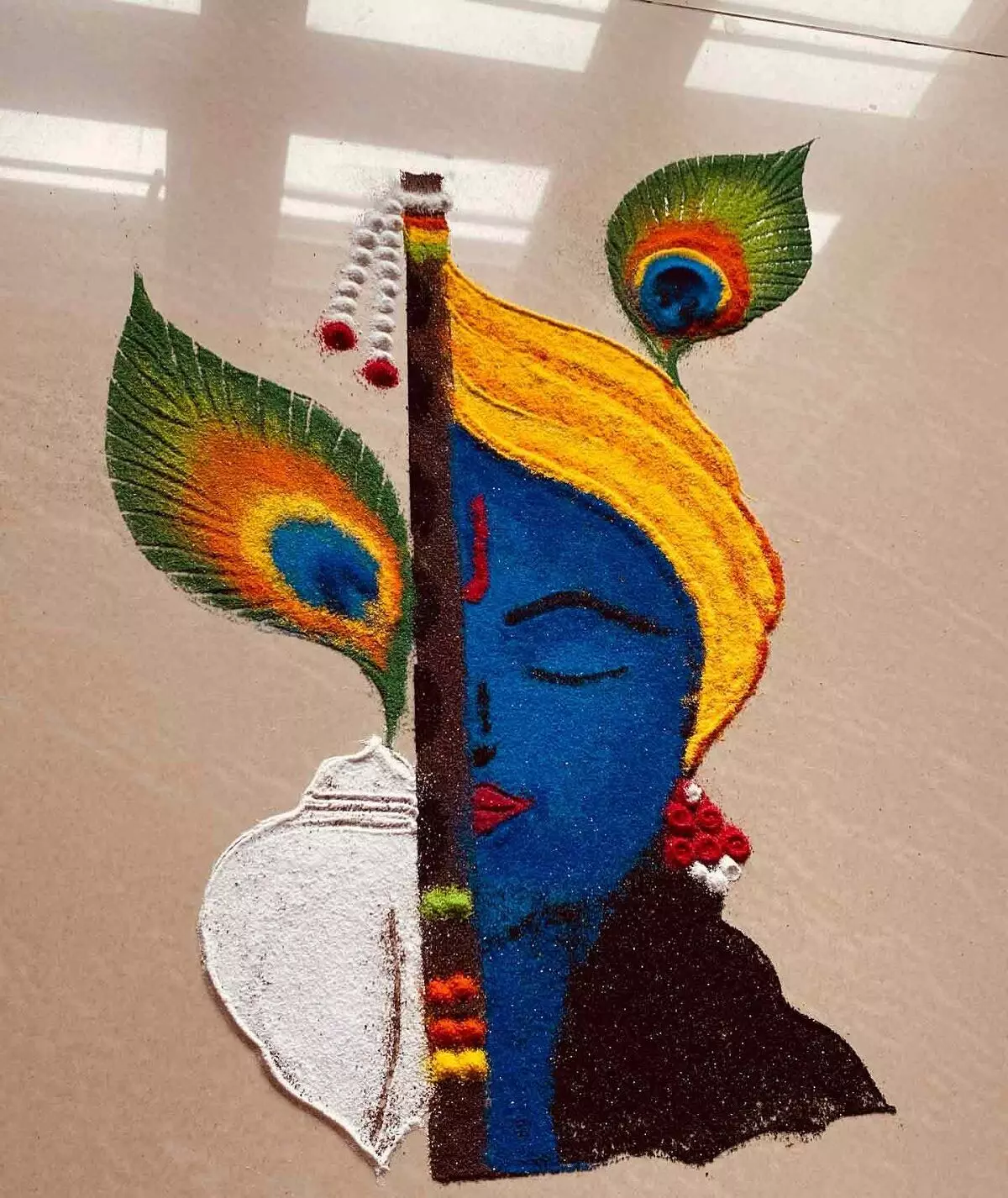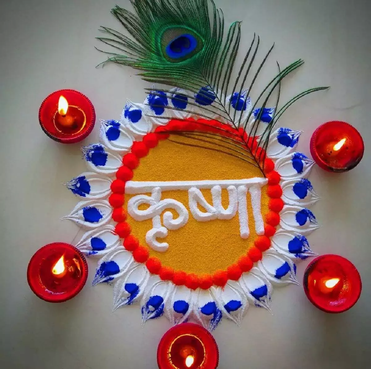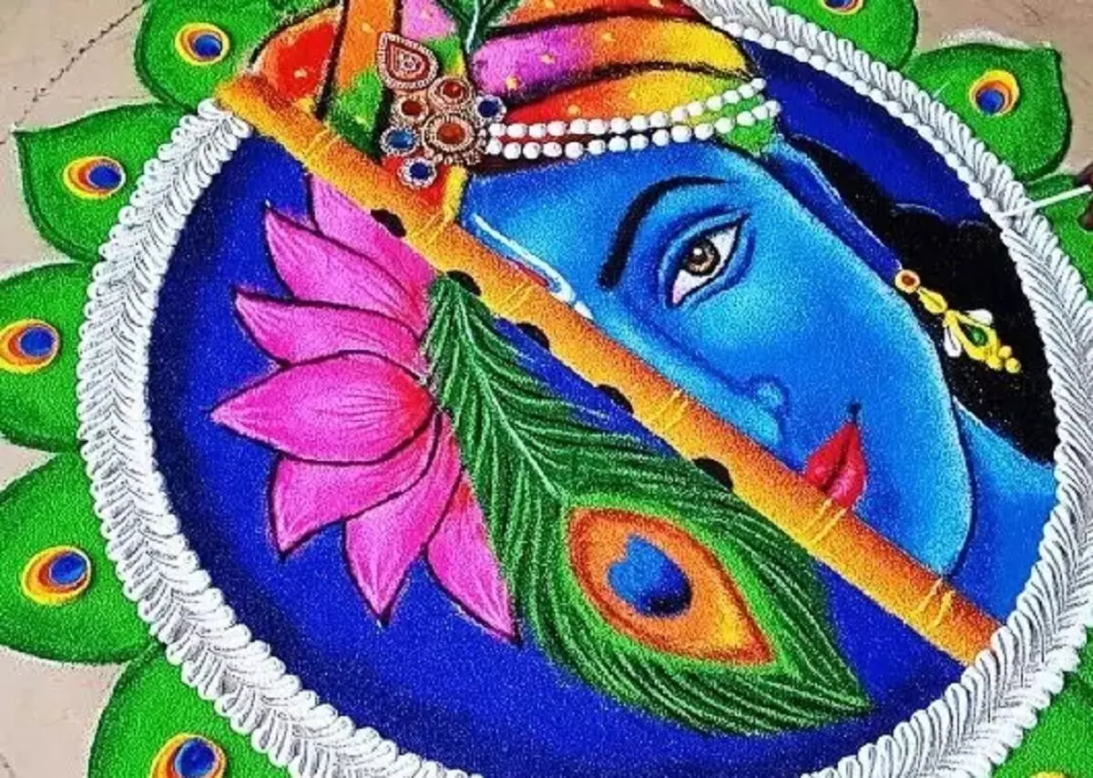 मोर के पंखों और श्री कृष्ण की आकृति वाली यह रंगोली आप अपने घर के बड़े और खाली स्थानों पर आसानी से बना सकती हैं। यह डिज़ाइन न सिर्फ आकर्षक है बल्कि आपके आंगन को एक दिव्य और भक्तिमय माहौल से भर देगा।