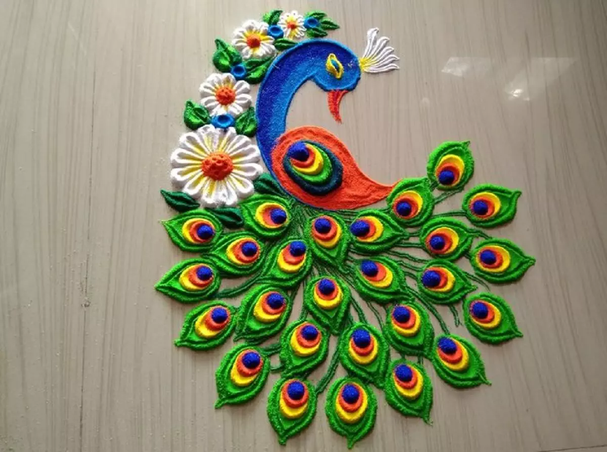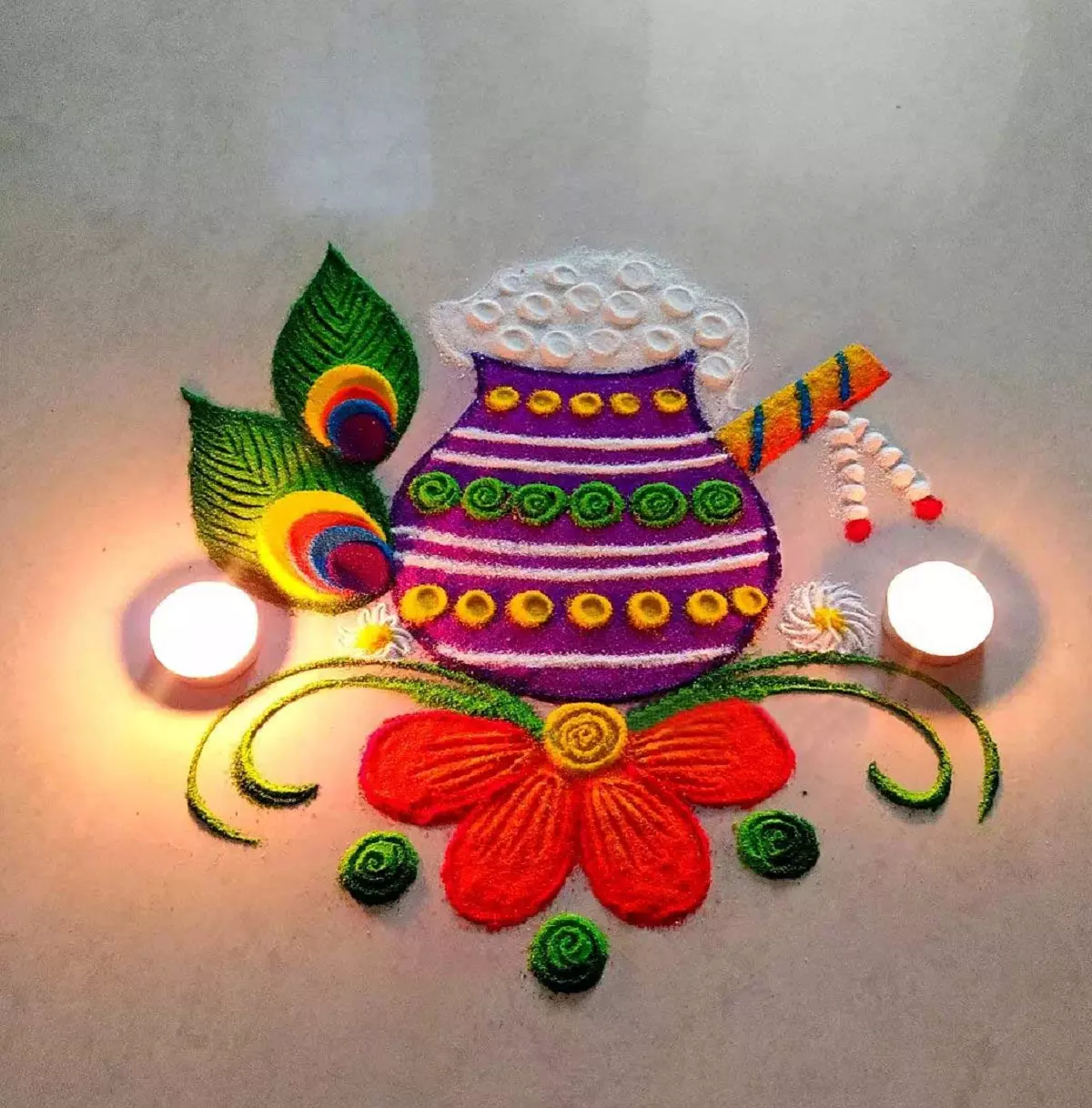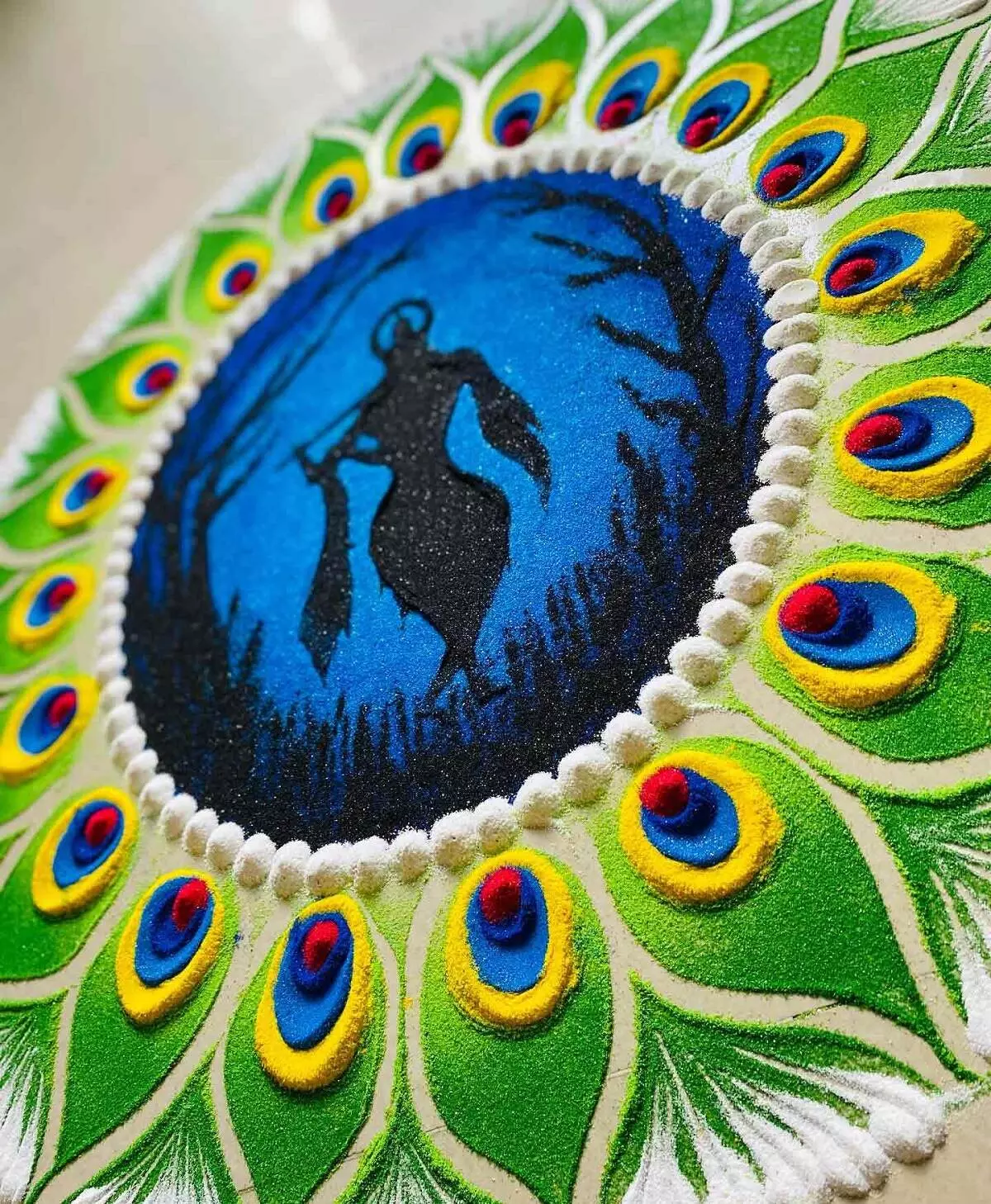 मोर के पंखों और श्री कृष्ण की आकृति वाली यह रंगोली आप अपने घर के बड़े और खाली स्थानों पर आसानी से बना सकती हैं। यह डिज़ाइन न सिर्फ आकर्षक है बल्कि आपके आंगन को एक दिव्य और भक्तिमय माहौल से भर देगा।