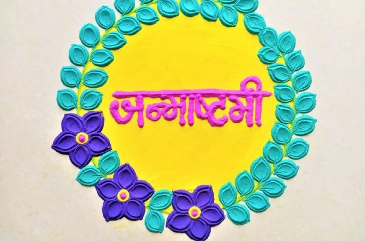 इस तरह रंगोली के बीच में आप “जन्माष्टमी” लिख सकते हैं। इसे घर के आंगन या पूजा घर के बाहर सजाकर इस पावन त्योहार की भव्यता को बढ़ाया जा सकता है।