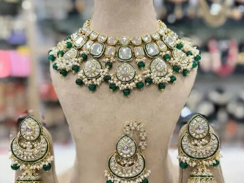 कुंदन ज्वेलरी हमेशा से ही भारतीय त्योहारों की जान रही है। अगर आप ट्रेडिशनल आउटफिट जैसे साड़ी, लहंगा या अनारकली पहन रही हैं, तो एक हैवी कुंदन चोकर सेट आपके लुक को रॉयल टच देगा। इसके साथ मेल खाते हुए झुमके और मांगटीका आपको बिल्कुल महारानी जैसी शान देंगे। यह डिजाइन खासकर दिवाली और करवा चौथ जैसे त्योहारों पर बहुत खूबसूरत लगता है।