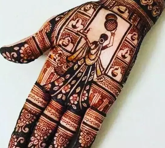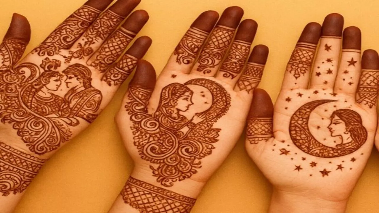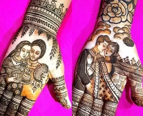 करवा चौथ का त्योहार पति-पत्नी के अटूट रिश्ते का प्रतीक है। ऐसे में हाथों में उस प्यार को उकेरना एक बेहतरीन आइडिया है। इस डिजाइन में दुल्हन और दूल्हे की आकृति बनाई जाती है। कभी वे पूजा करते नजर आते हैं तो कभी एक-दूसरे की ओर मुस्कुराते हुए। यह डिजाइन न सिर्फ खूबसूरत होते हैं, बल्कि हर नजर में एक कहानी कहते हैं। अगर आप चाहें तो इस डिजाइन में अपने पति का नाम या शुरुआती अक्षर भी जोड़ सकती हैं।