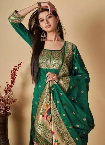 अगर आप तीज पर ट्रेडिशनल के साथ रॉयल लुक चाहती हैं, तो बनारसी फैब्रिक में बना हरा सलवार सूट एक बेहतरीन विकल्प है। यह लुक न सिर्फ पूजा के समय उपयुक्त लगेगा, बल्कि परिवार के फंक्शन या तीज मिलन जैसे आयोजनों में भी शानदार दिखेगा।आप इसे जरी बॉर्डर वाली चूड़ीदार या प्लाजो के साथ पहन सकती हैं। इसके साथ गोल्डन ज्वेलरी और बालों में जरा लगा सकती हैं।