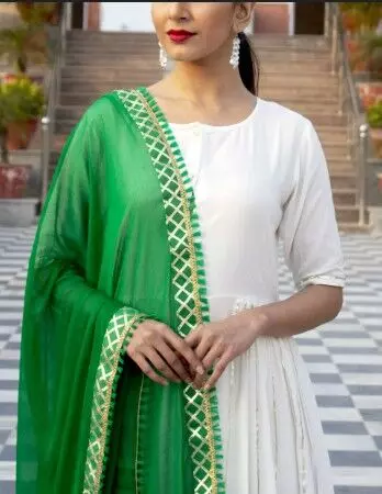 हरा रंग तिरंगे के निचले हिस्से में होता है, जो प्रगति, शांति और समृद्धि का प्रतीक है। सफेद सूट के साथ हरा दुपट्टा पहनकर आप एक फ्रेश और बैलेंस्ड लुक पा सकती हैं। हल्के एम्ब्रॉइडरी वाला हरा दुपट्टा और मैचिंग बिंदी आपके लुक को परफेक्ट और फेस्टिव बना देगा।