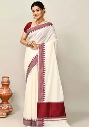 ओणम की पहचान मानी जाने वाली केरला कसावु साड़ी आमतौर पर सफेद या ऑफ-व्हाइट बेस और सुनहरे बॉर्डर के साथ आती है। लेकिन अगर आप इसमें लाल रंग का टच जोड़ दें तो आपका लुक और भी ज्यादा आकर्षक बन जाएगा। आप चाहें तो पूरी लाल साड़ी पहनें या फिर ऑफ-व्हाइट कसावु साड़ी को लाल ब्लाउज़ के साथ स्टाइल करें। दोनों ही लुक आपको बेहद शालीन और त्योहार के अनुसार पारंपरिक बनाएंगे।