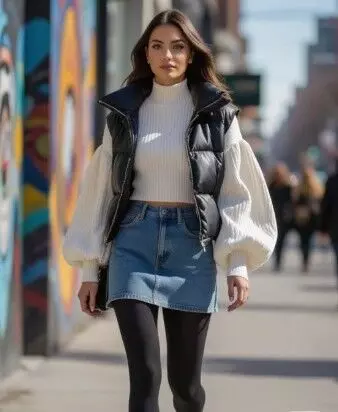 जो महिलाएं सर्दियों में भी अपने बोल्ड दिखना चाहती हैं, उनके लिए शॉर्ट डेनिम स्कर्ट एक शानदार विकल्प है। हालांकि ठंड में शॉर्ट स्कर्ट पहनना थोड़ा मुश्किल हो सकता है, लेकिन सही स्टाइलिंग से आप इसे आरामदायक बना सकती हैं। शॉर्ट डेनिम स्कर्ट के साथ स्टॉकिंग्स या वूलन लेगिंग्स पहनें, ताकि ठंड से बचा जा सके। इस तरह की स्कर्ट कॉलेज जाने वाली लड़कियों के लिए सही लगती है।