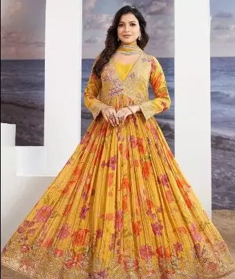 अगर आप ट्रेडिशनल के साथ-साथ मॉडर्न टच चाहती हैं तो येलो फ्लोरल अनारकली सूट सबसे बेस्ट रहेगा। हल्की फ्लोरल प्रिंट और दुपट्टे के साथ यह सूट न केवल आरामदायक है बल्कि आपको एक रॉयल लुक भी देगा।