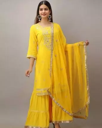मिरर वर्क येलो शरारा सूट