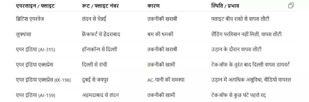19 जून को दिल्ली से वियतनाम जा रही एअर इंडिया की फ्लाइट AI388 को बीच रास्ते से वापस दिल्ली बुलाया गया। प्लेन में तकनीकी खामी का पता चला। दिल्ली से लेह जा रही इंडिगो फ्लाइट 6E 2006 तकनीकी खराबी के कारण दिल्ली लौटी थी। हैदराबाद से तिरुपति जा रही फ्लाइट SG 2696 उड़ान भरने के 10 मिनट बाद वापस लौटी थी।। इंडिगो एयरलाइन विमान गुवाहाटी से चेन्नई जा रहा था। फ्यूल की कमी के चलते बेंगलुरु में उतारा गया। रीफ्यूलिंग के बाद वापस चेन्नई के लिए उड़ा।