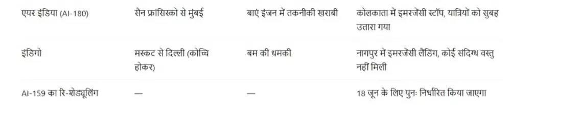 अहमदाबाद से लंदन जा रही एयर इंडिया की फ्लाइट AI-159 17 जून को तकनीकी खराबी के चलते रद्द करनी पड़ी। एयर इंडिया की सैन फ्रांसिस्को से मुंबई जा रही फ्लाइट AI-180 को कोलकाता में रोकना पड़ा, क्योंकि विमान के बाएं इंजन में तकनीकी समस्या आई गई थी। इंडिगो की अंतरराष्ट्रीय फ्लाइट को भी बम की धमकी के कारण नागपुर एयरपोर्ट पर इमरजेंसी लैंडिंग करानी पड़ी। यह फ्लाइट मस्कट से कोच्चि होते हुए दिल्ली जा रही थी। नागपुर पुलिस ने गहन जांच पड़ताल की, लेकिन कोई संदिग्ध वस्तु नहीं मिली।