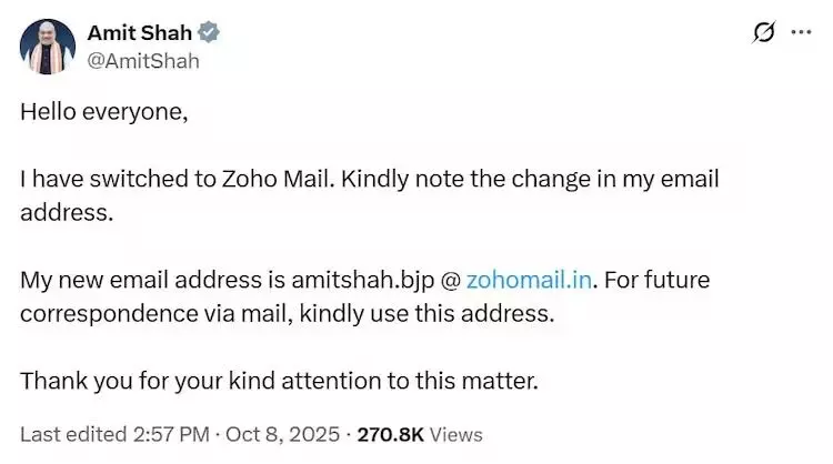अमित शाह ने सोशल मीडिया प्लेटफॉर्म X (पूर्व में ट्विटर) पर लिखा, “Hello everyone, I have switched to Zoho Mail. Kindly note the change in my email address.”“Thank you for your kind attention to this matter.”