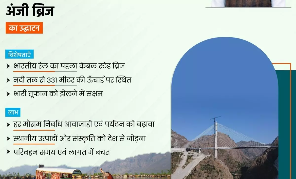 यह अद्भुत पुल संरचना चेनाब की सहायक अंजी नदी पर बनाई गई है। उधमपुर-श्रीनगर-बारामुल्ला रेल लिंक (USBRL) परियोजना के तहत इसे विकसित किया गया है। यह पुल न सिर्फ दुर्गम पहाड़ी क्षेत्रों में रेलवे संपर्क को मजबूती देगा, बल्कि जम्मू-कश्मीर के पर्यटन उद्योग को भी नई उड़ान देगा।