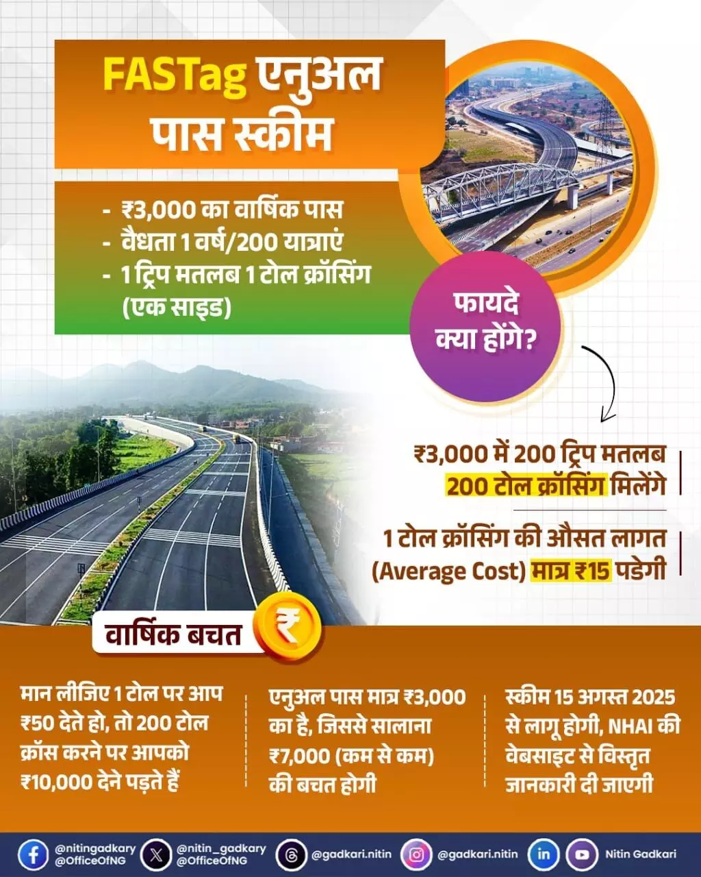 Save 7,000 rupees with annual toll pass, applicable from August 15: केंद्र सरकार ने आम लोगों को बड़ी राहत देते हुए एक नई स्कीम की घोषणा की है। केंद्रीय सड़क परिवहन और राजमार्ग मंत्री नितिन गडकरी ने बुधवार (18 जून) को बताया कि एनुअल टोल पास स्कीम के जरिए वाहन चालकों को सालभर में 7,000 रुपए तक की बचत हो सकेगी।