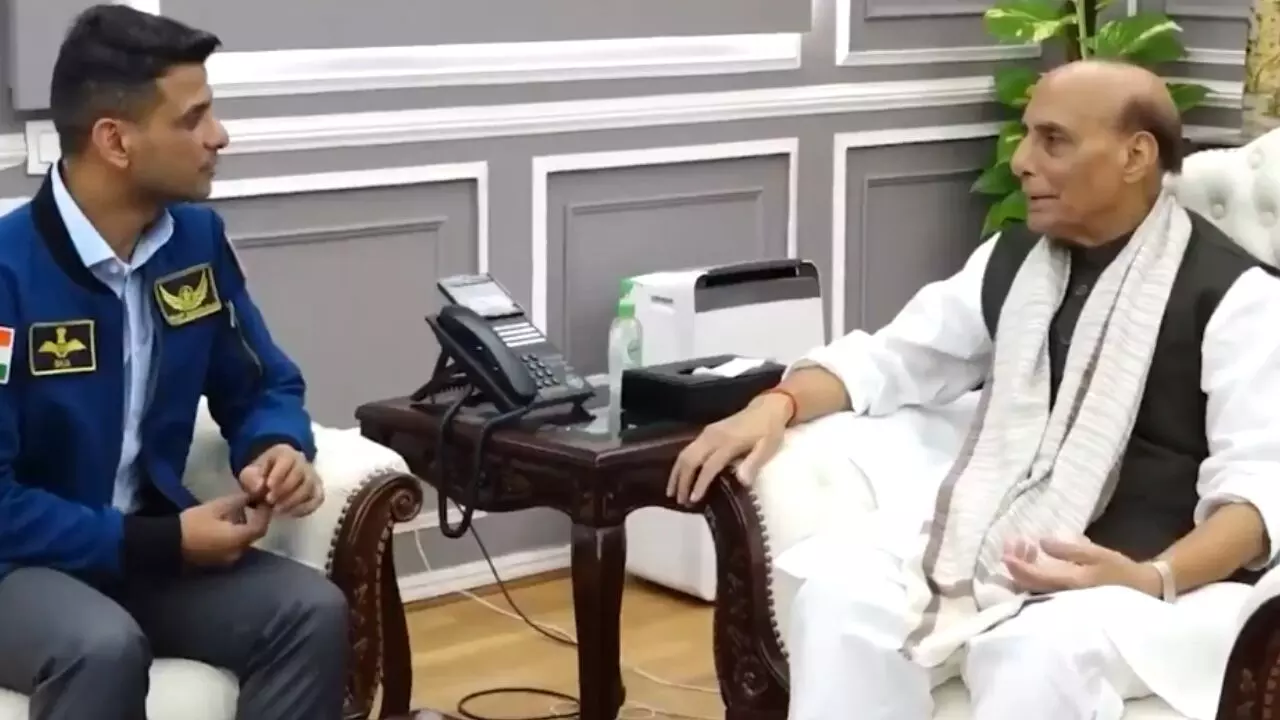 रक्षामंत्री राजनाथ सिंह से मुलाकात करते अंतरिक्ष यात्री शुभांशु शुक्ला