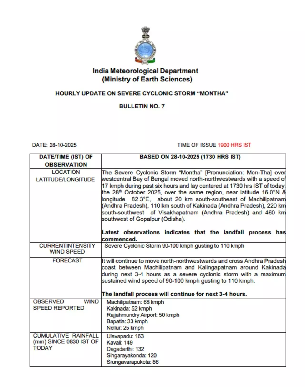 चक्रवात मोन्था- Live Updates: आंध्र प्रदेश: गंभीर चक्रवाती तूफान ‘मोंथा’ अब कमजोर होकर चक्रवाती तूफान में बदल गया है और वर्तमान में तटीय आंध्र प्रदेश के ऊपर सक्रिय है।